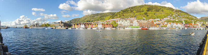 180 Grad Hafenpanorama von Bergen. Hierher oder ins Bild klicken für eine größere Darstellung.