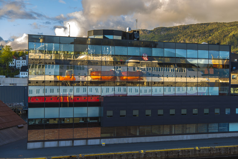 Unser Schiff spiegelt sich in der Glasfassade des Hurtigruten - Gebäudes.