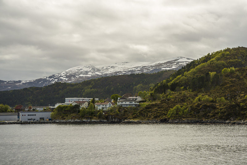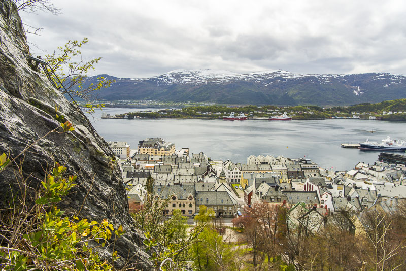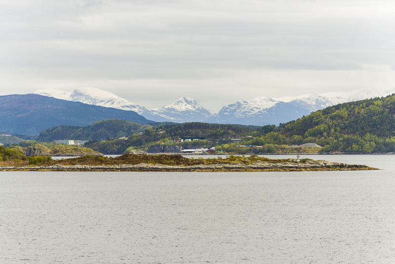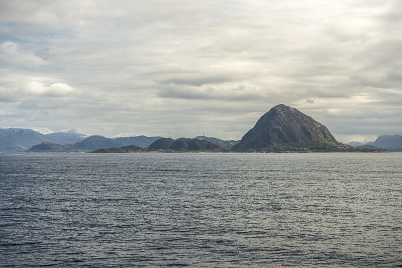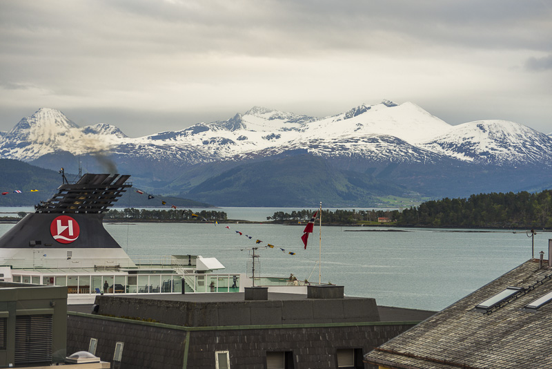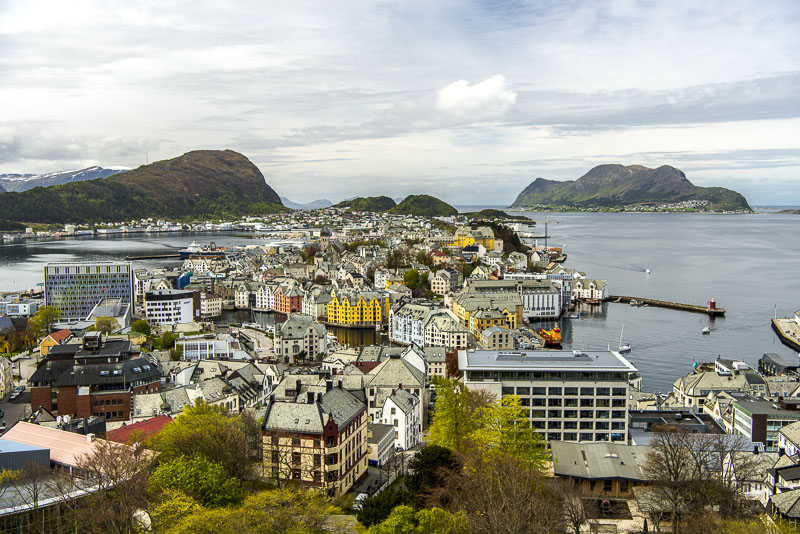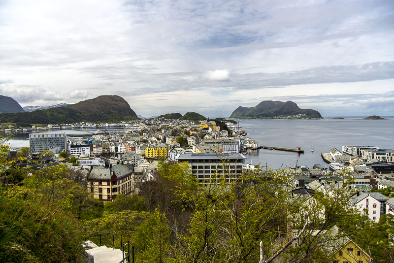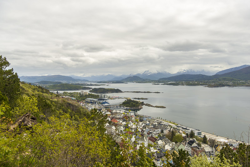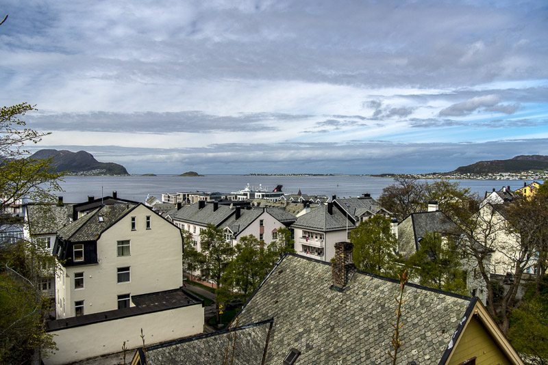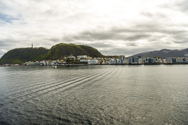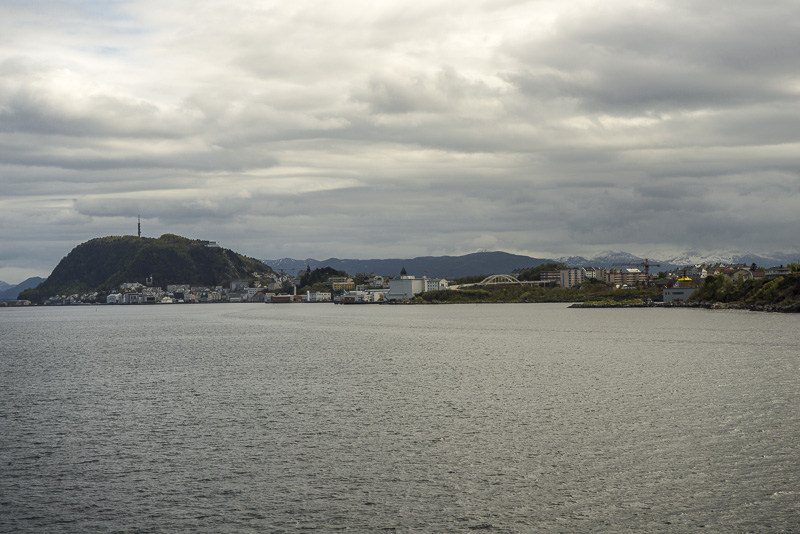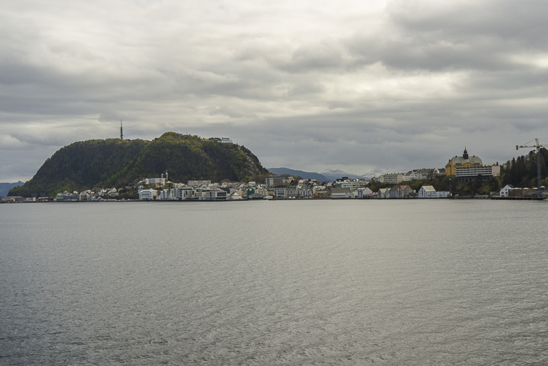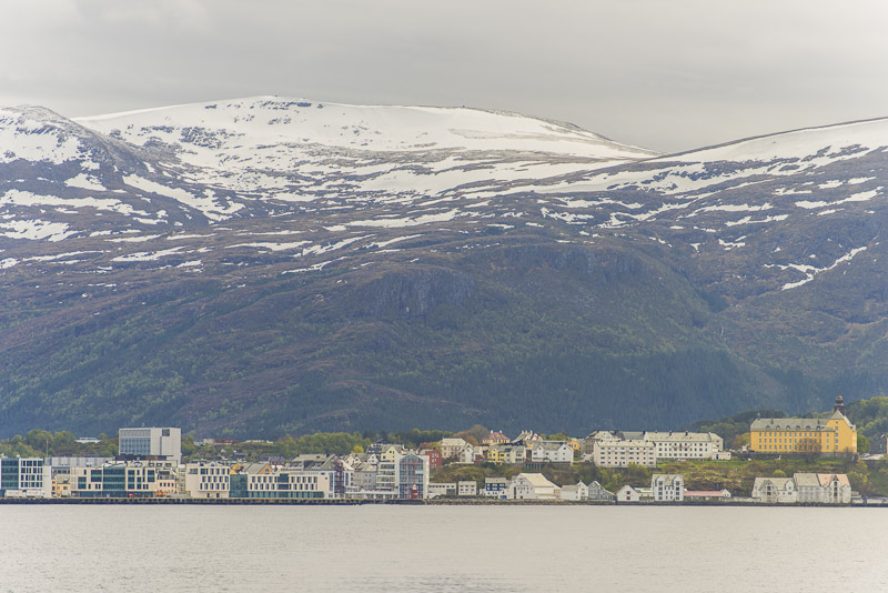 Ålesund im Zoom - mit den hohen Bergen der Insel Sula dahinter (bis über 700 m). Dazwischen ist aber schon noch ein Meeresarm ...