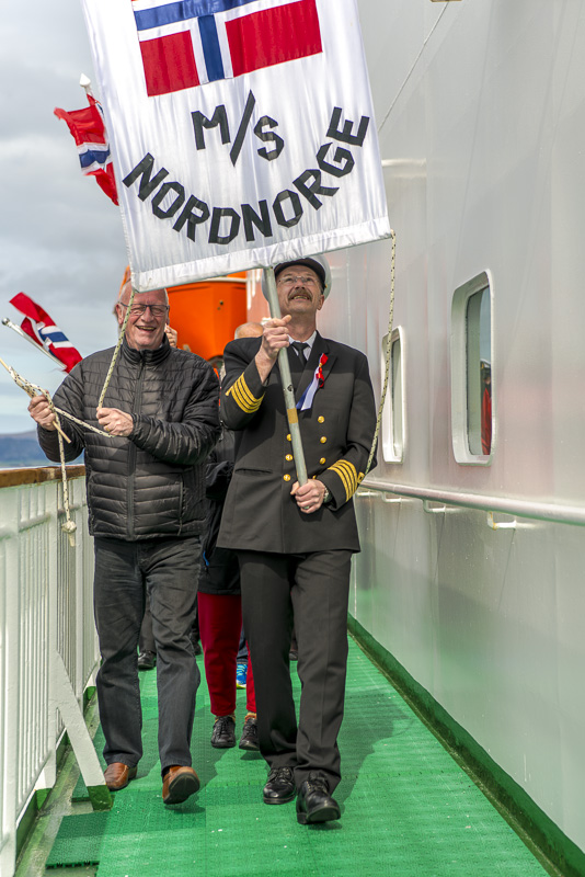 Anschließend marschiert der Kapitän mit der Crew und mit allen, die sich anschließen wollen (wohl vor allem Norweger) ein mal rund um das Schiff.