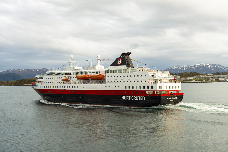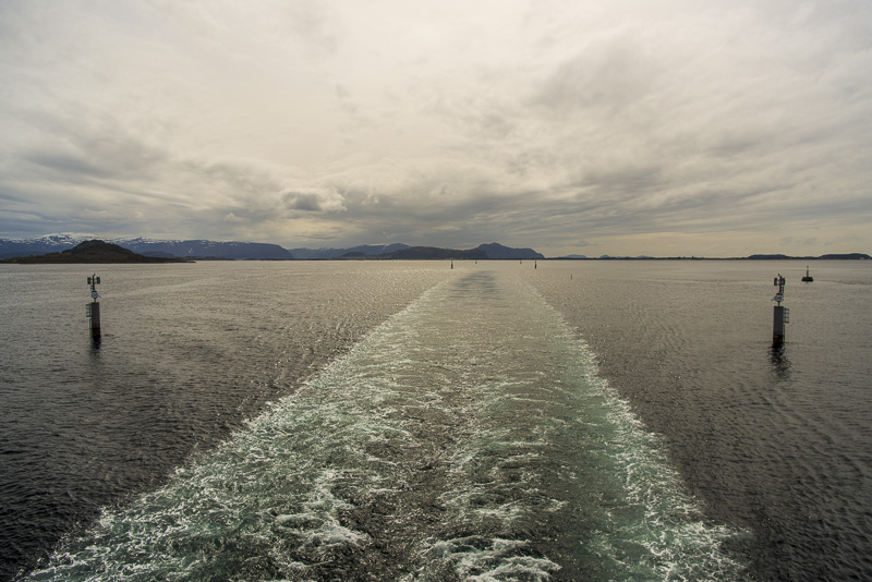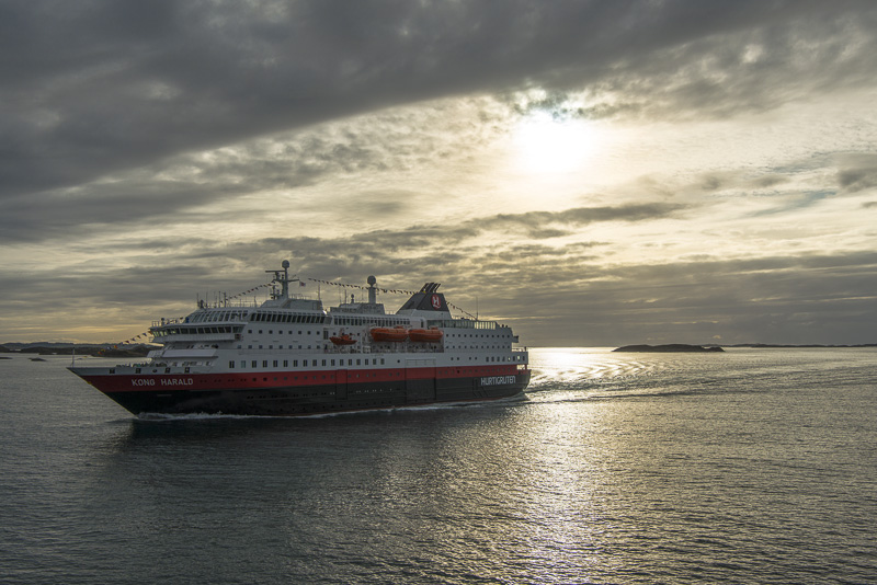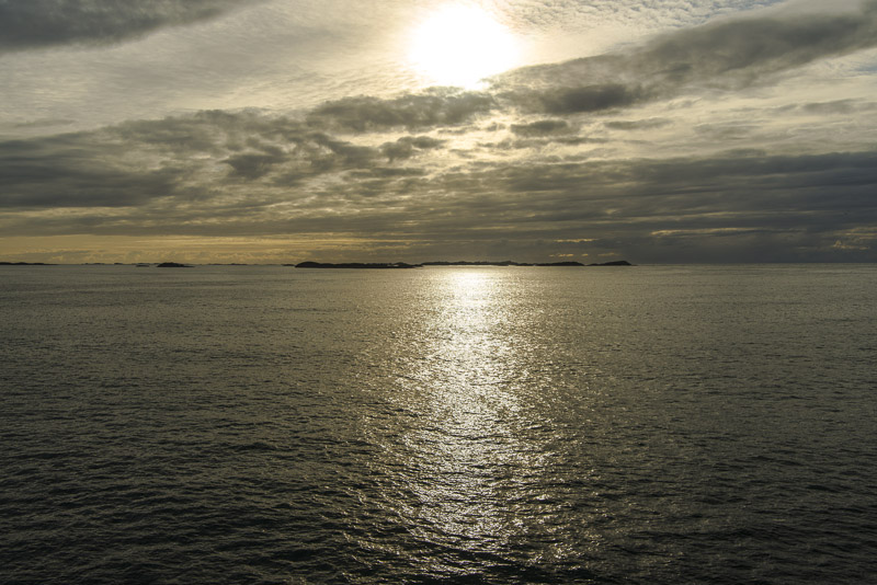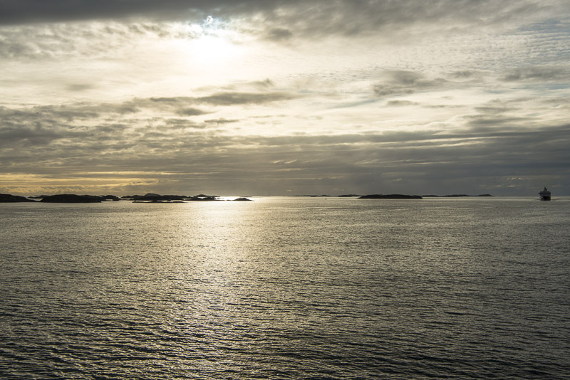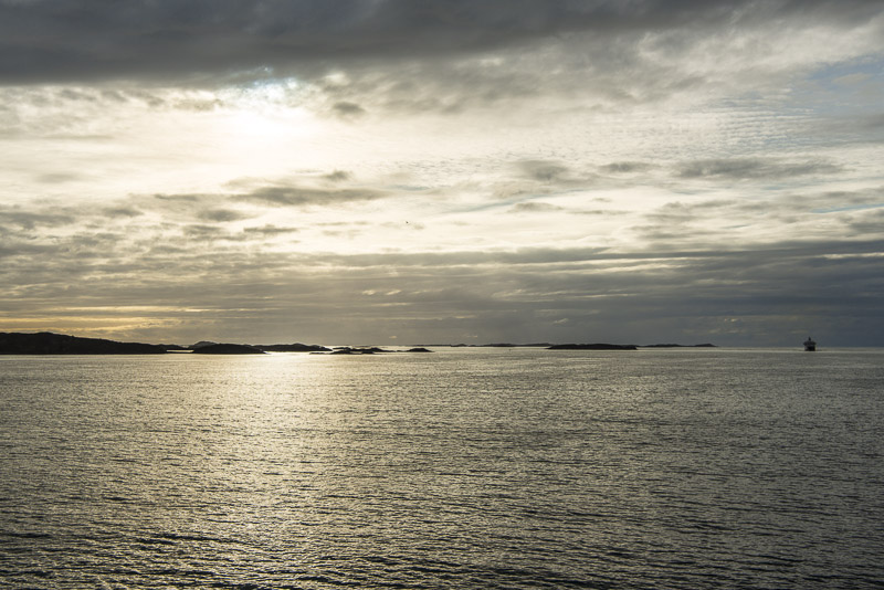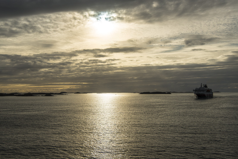 Es ist Abend, es geht übers offene Meer, das Land ist weiter weg und ich bin müde, ziehe mich daher aufs Panoramadeck zurück, um zu lesen. Beim momentan stärkeren Wellengang tut mir das aber nicht so gut, und ich lande schließlich in meiner Kabine. Ich verzichte daher auch darauf, in Kristiansund von 22:15 bis 23:00 an Land zu gehen, bleibe in meinem Bett liegen und bin bald nach dem Ablegen eingeschlafen. Kristiansund werden wir auf unserer Rückfahrt noch einmal am frühen Nachmittag sehen.