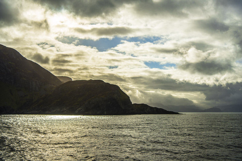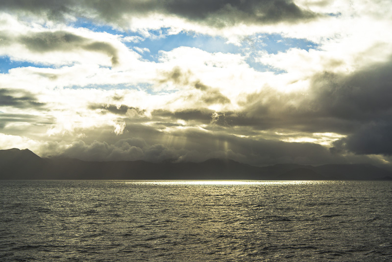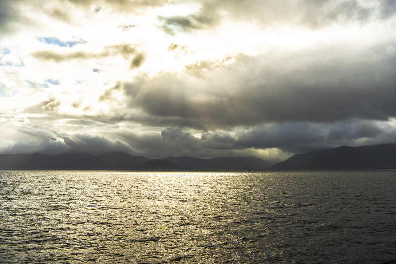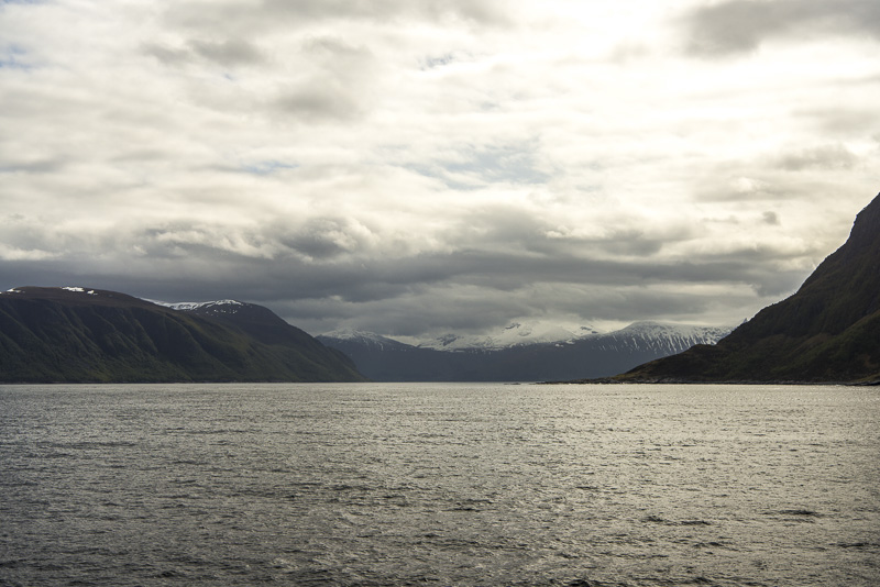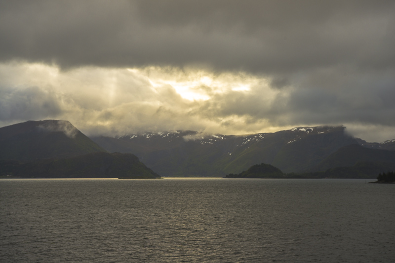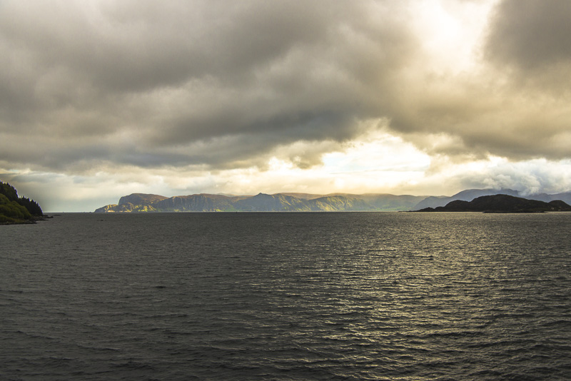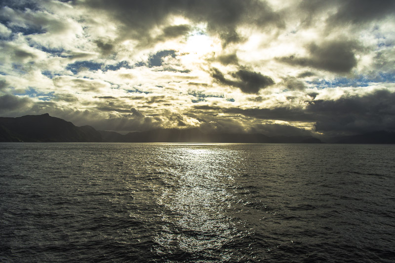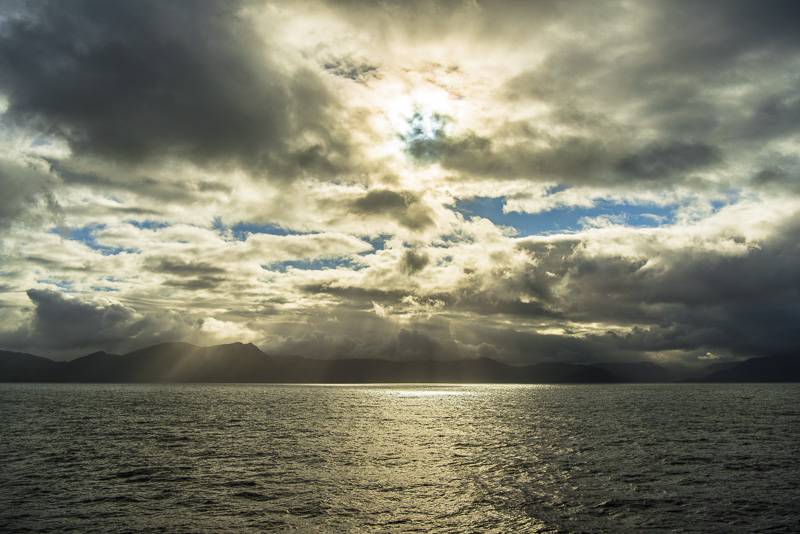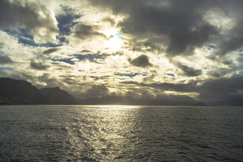 Erste Sonnenlöcher über der großen Bucht des Sildegapet, die wir jetzt überqueren.