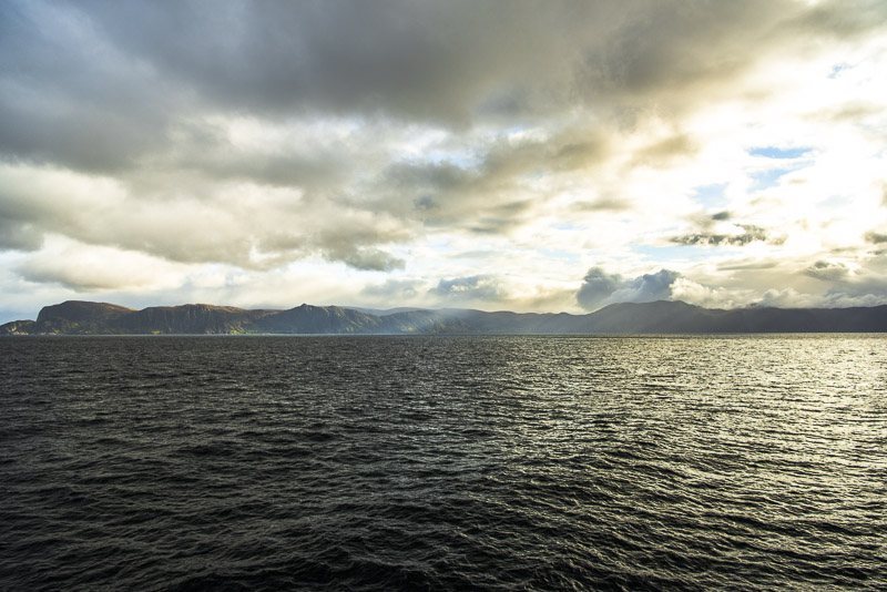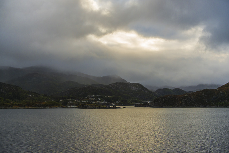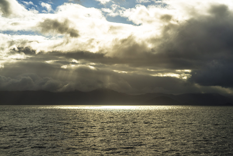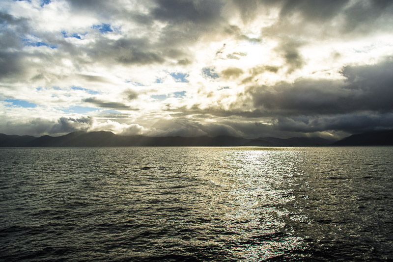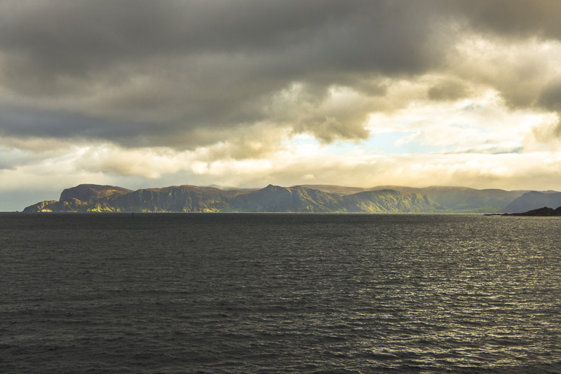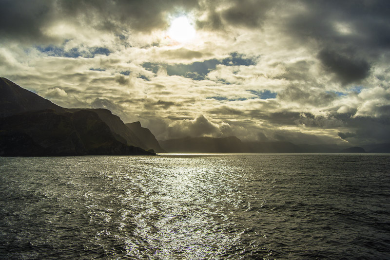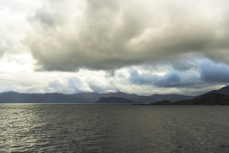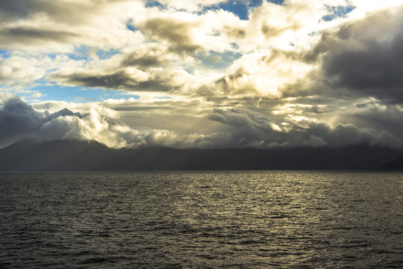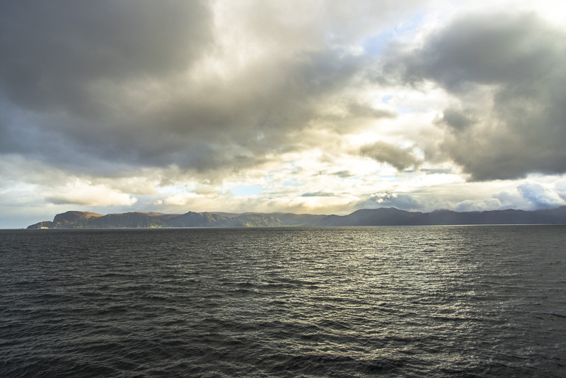 Erste Sonnenlöcher über der großen Bucht des Sildegapet, die wir jetzt überqueren.