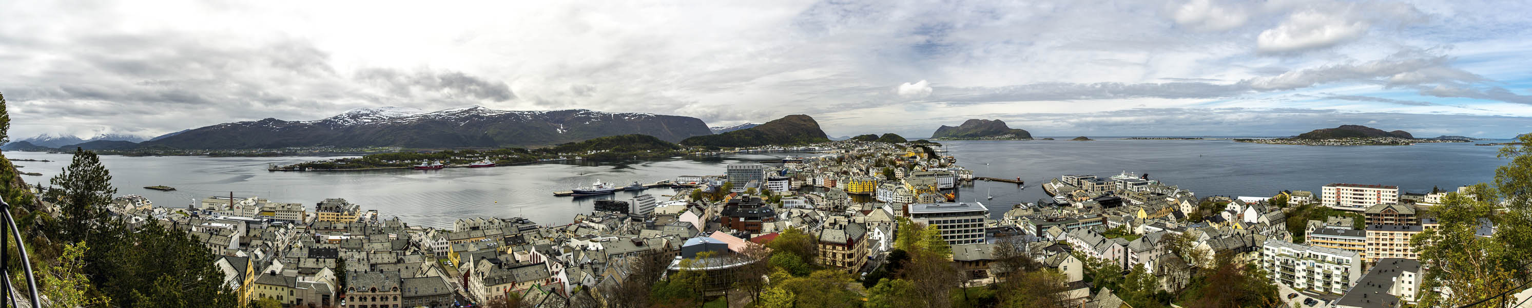 Panoramic view over Ålesund from half way up the Aksla rock.