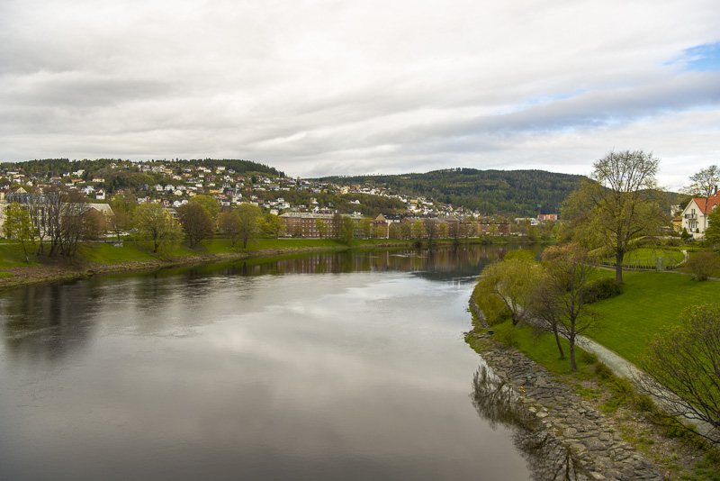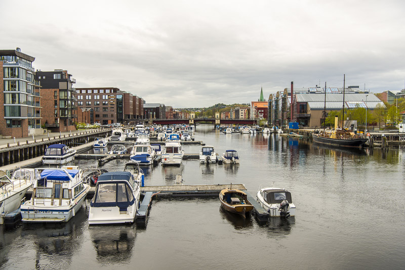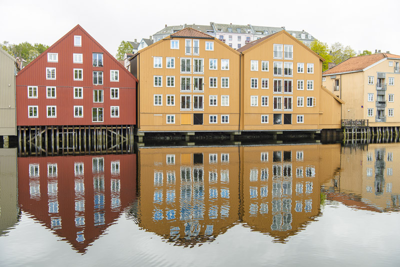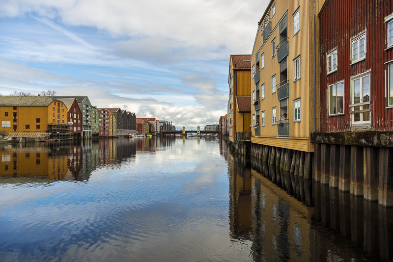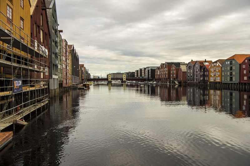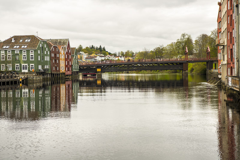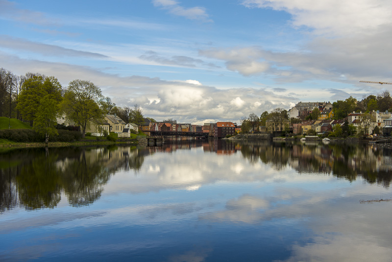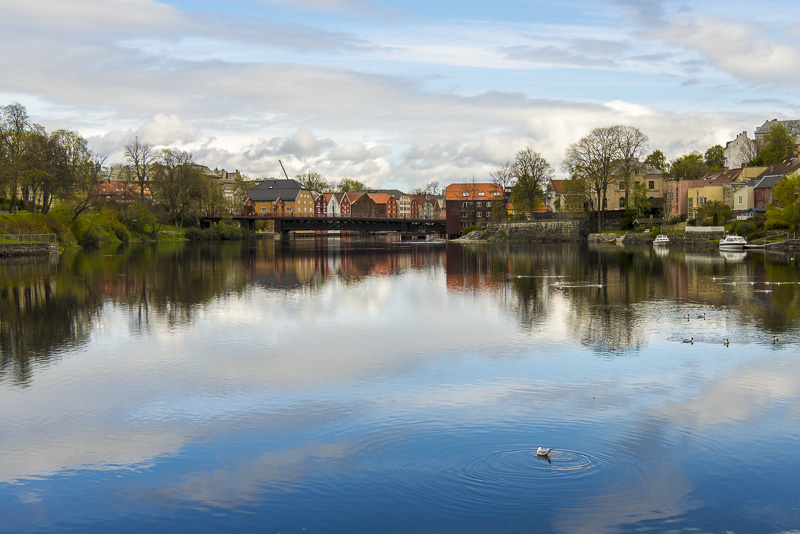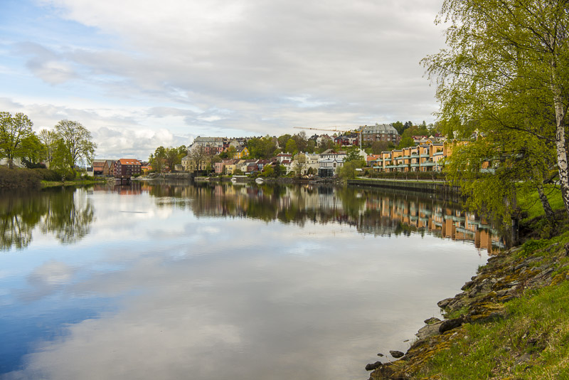 Der Nidelva - Fluss durchzieht Trondheim. Die Häuser sind bis zum Wasser gebaut, teilweise dann noch auf Pfählen errichtet.