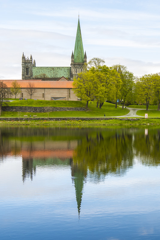 Der Nidaros Dom spiegelt sich wunderschön im Wasser des Nidelva - Flusses.