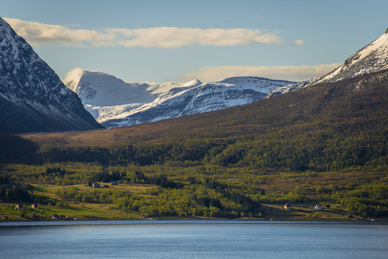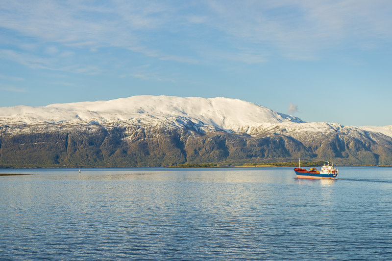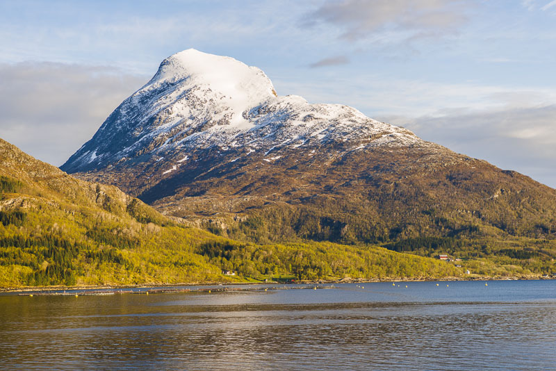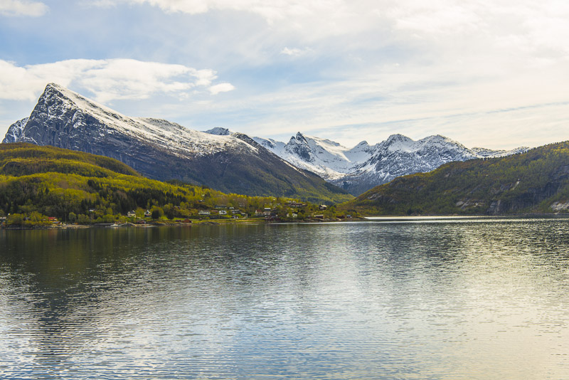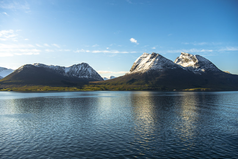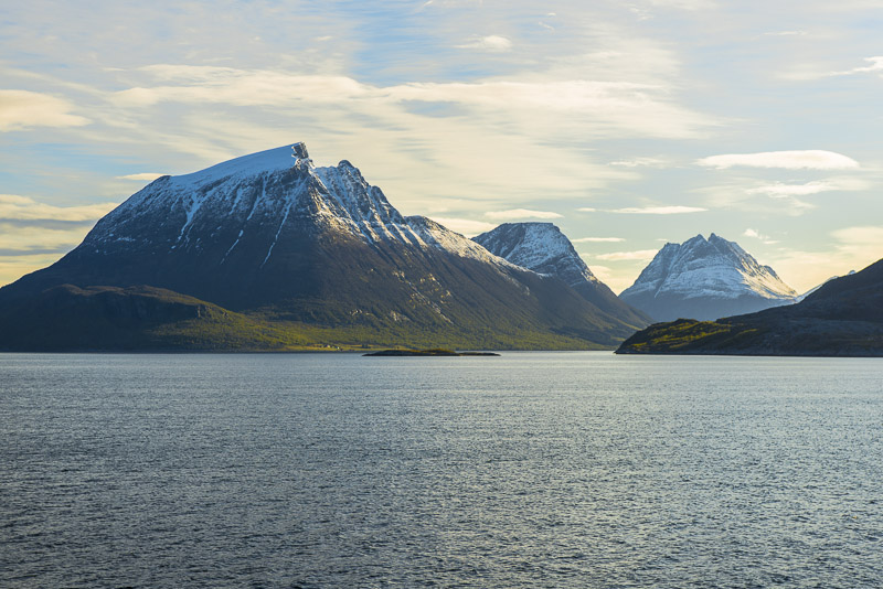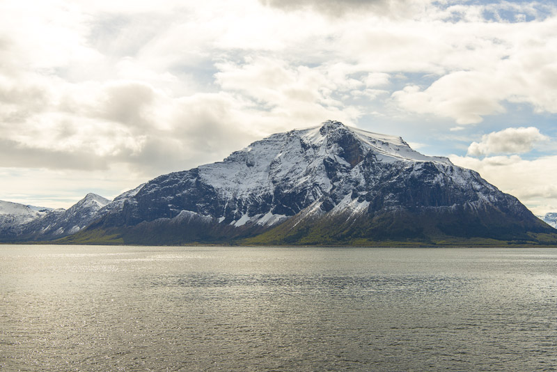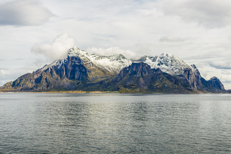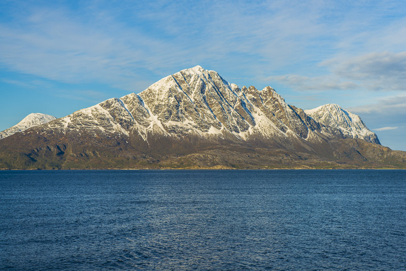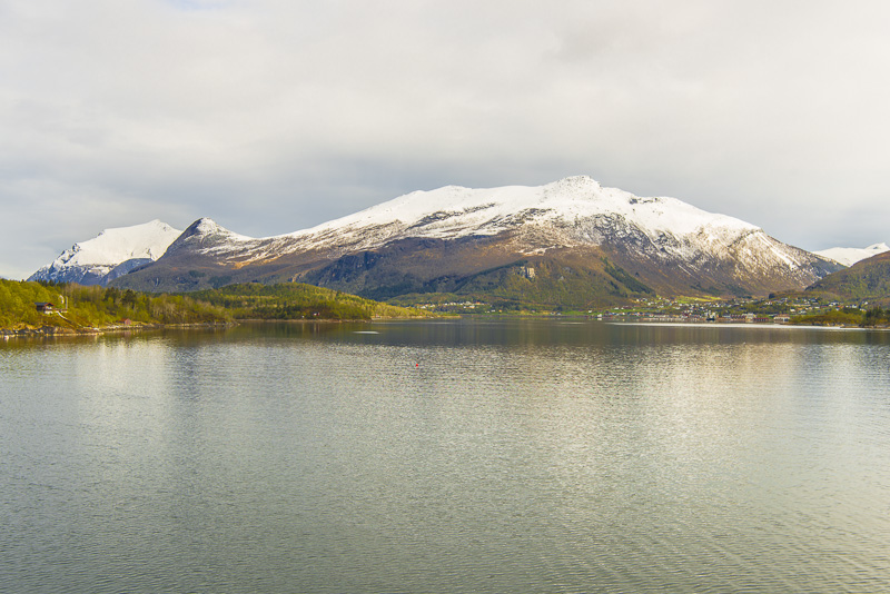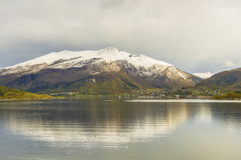 In der Nacht scheint es geschneit zu haben - deshalb sind die Berge heute besonders weiß. Der markante Berg rechts ist der Tomskjevelen (922 m)