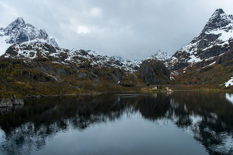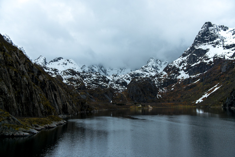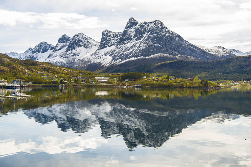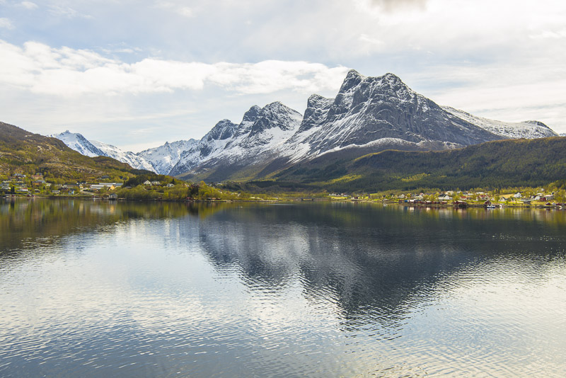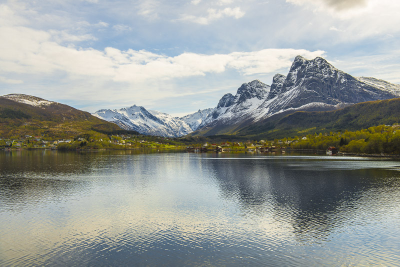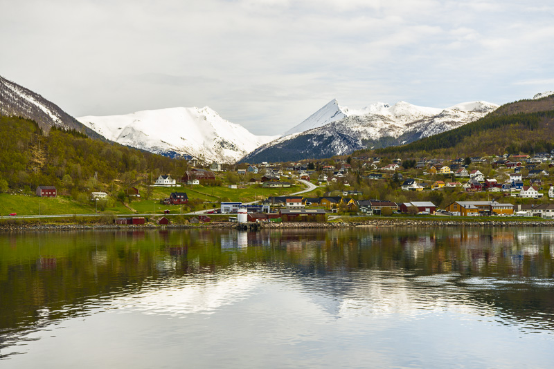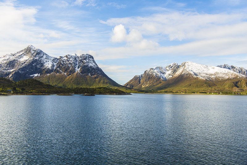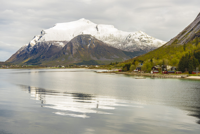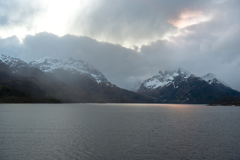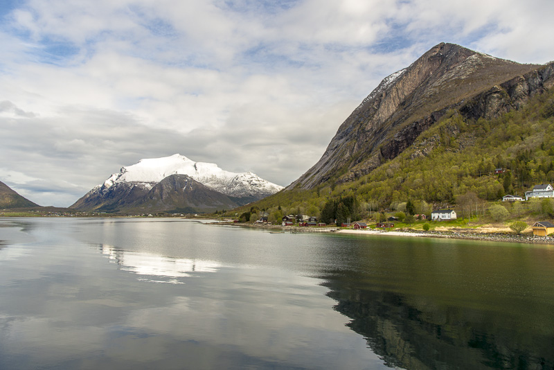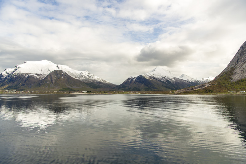 In der Nacht scheint es geschneit zu haben - deshalb sind die Berge heute besonders weiß. Der markante Berg rechts ist der Tomskjevelen (922 m)