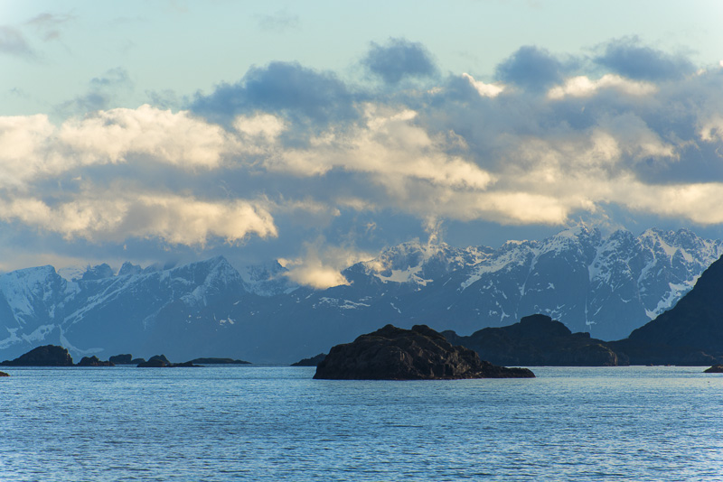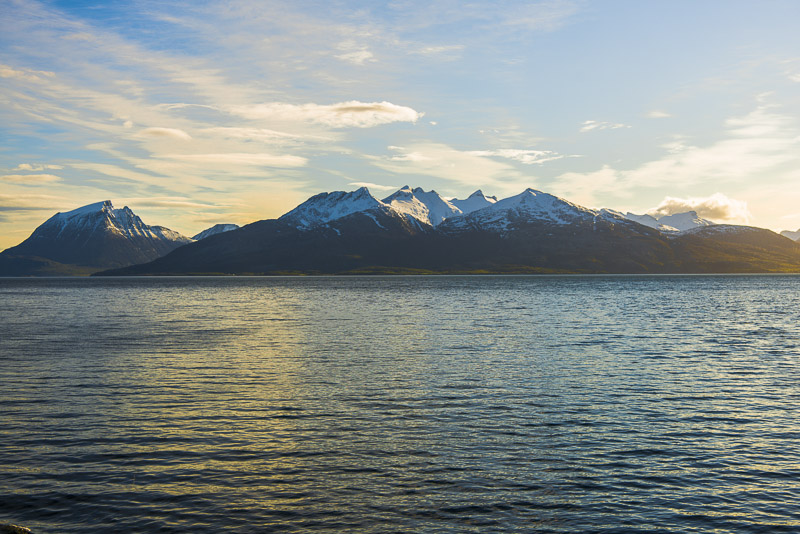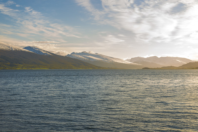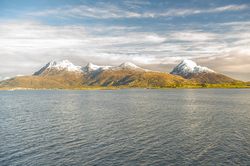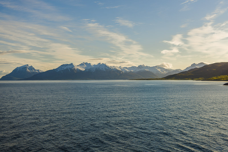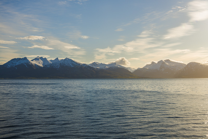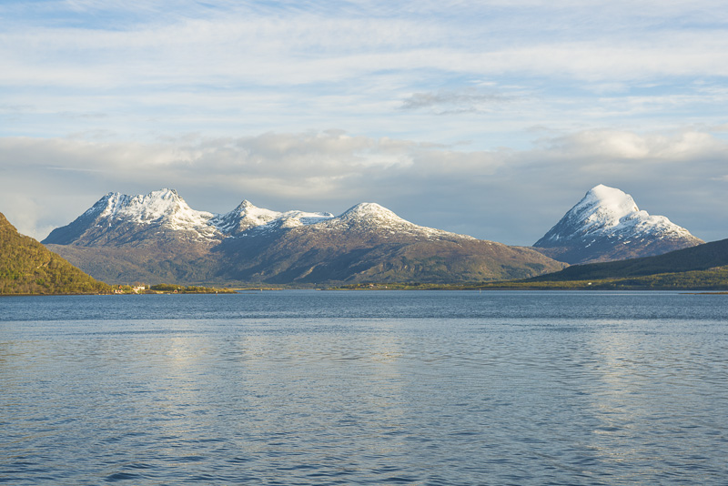 Gegenüber von Bodø, in südlicher Richtung hinter dem Saltfjorden, wieder hohe Berge: Fjellfjellet, Falkflogfjellet und die Berge des Børvasstindan (nehme ich an).