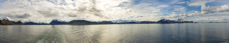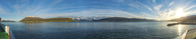 Panoramabild des Stottfjorden. Nicht leicht vom fahrenden Schiff aus, und natürlich auch nicht ohne Fehler möglich. Hierher oder ins Bild klicken für eine größere Darstellung.