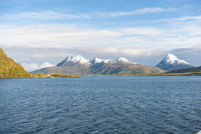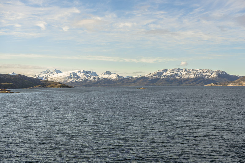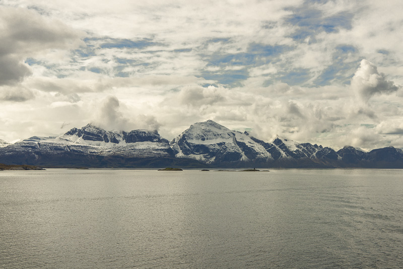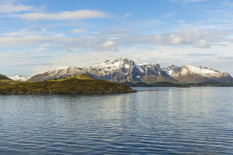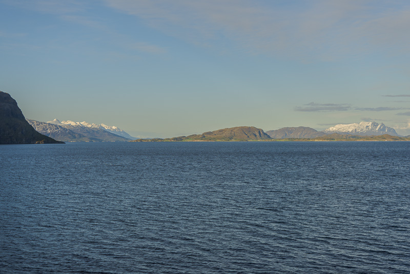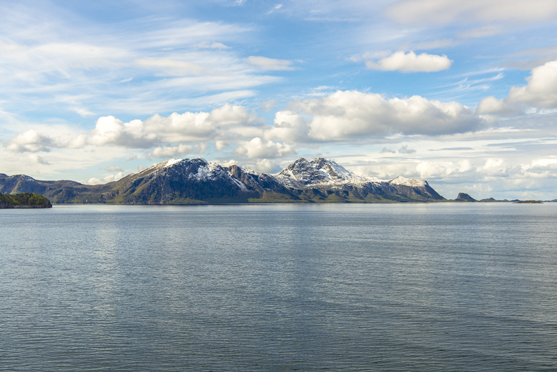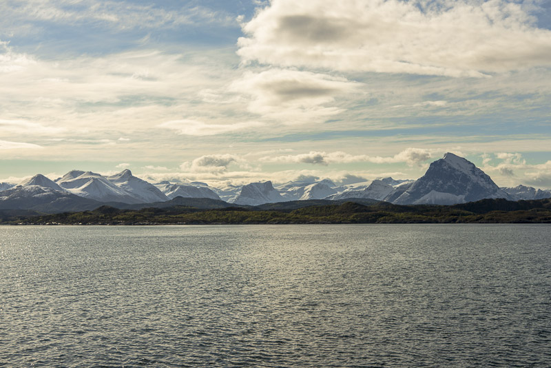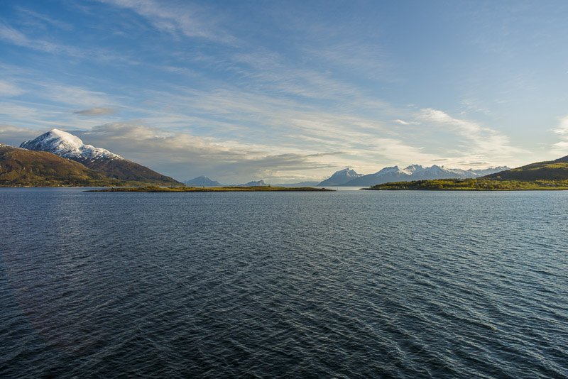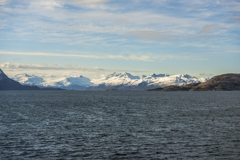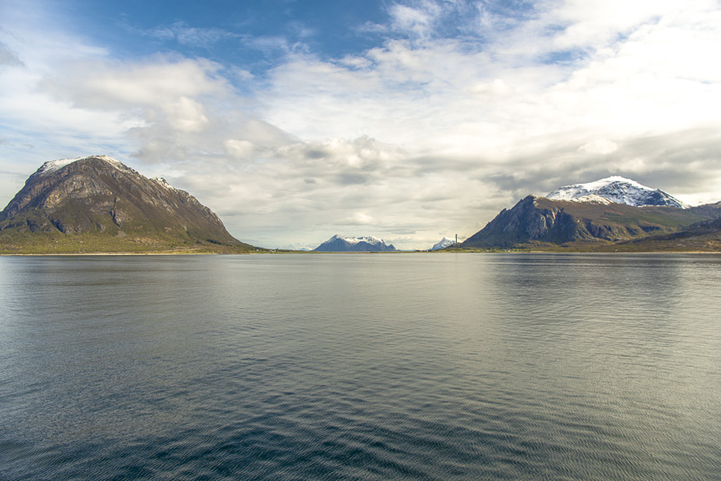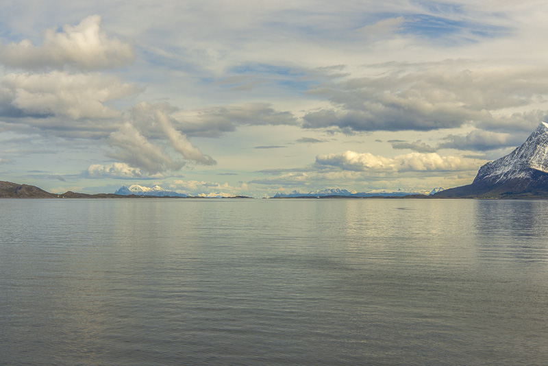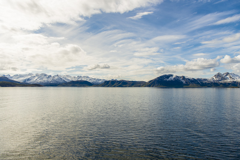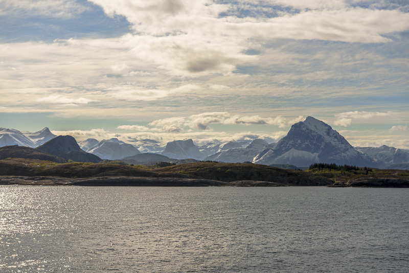 Der Blick nach Norden durch eine Lücke, die wir später befahren werden, geht hier bis zu den schneebedeckten Bergen der Lofoten. Die Sichtweite ist heute 120 km.