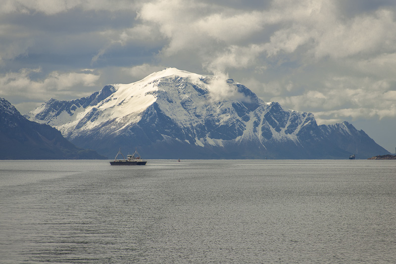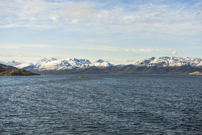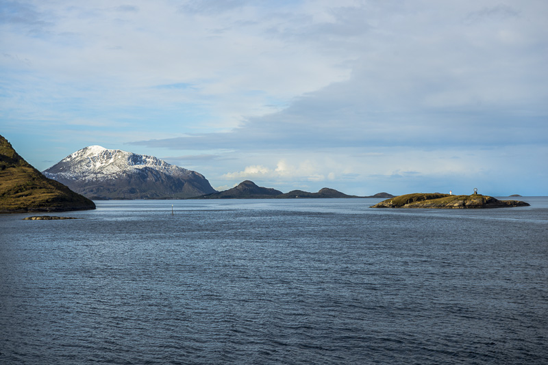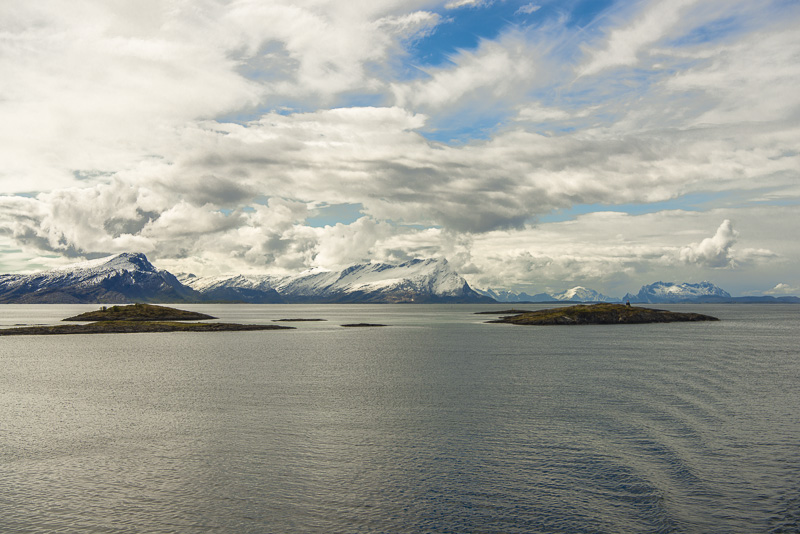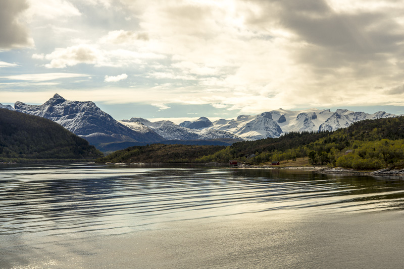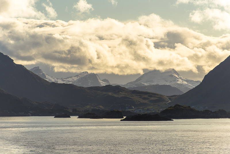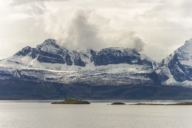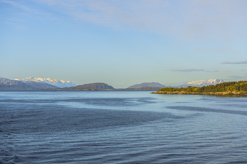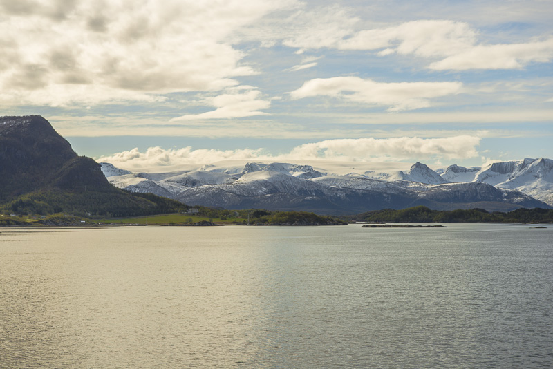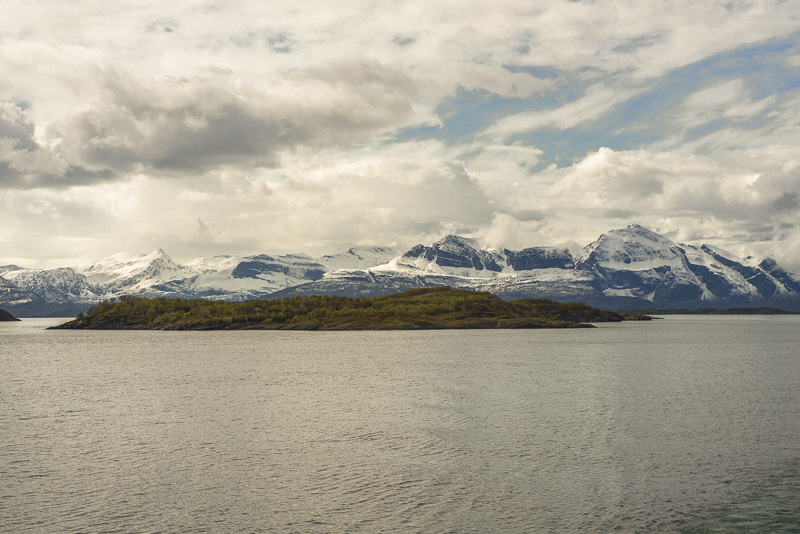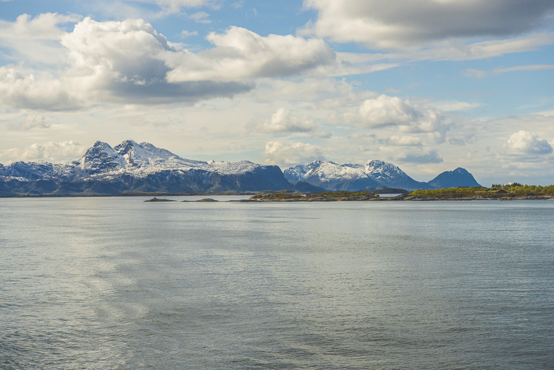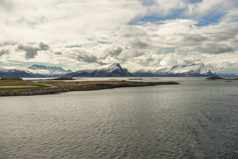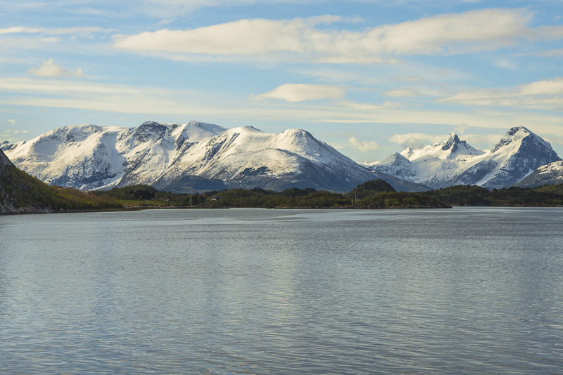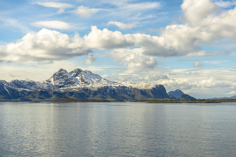 Der Blick nach Norden durch eine Lücke, die wir später befahren werden, geht hier bis zu den schneebedeckten Bergen der Lofoten. Die Sichtweite ist heute 120 km.