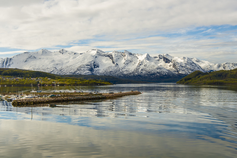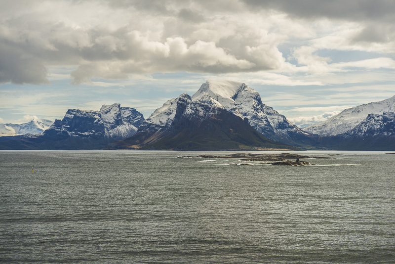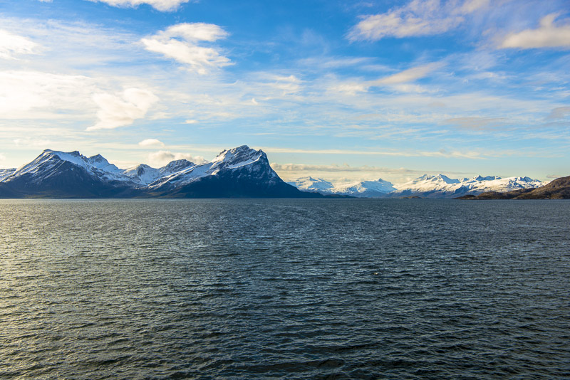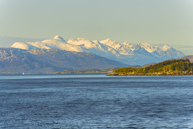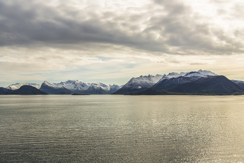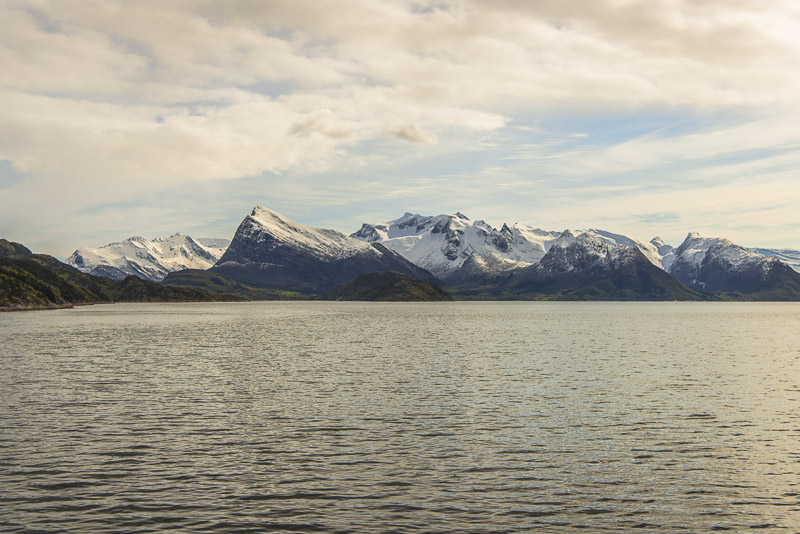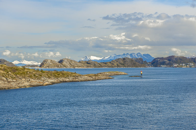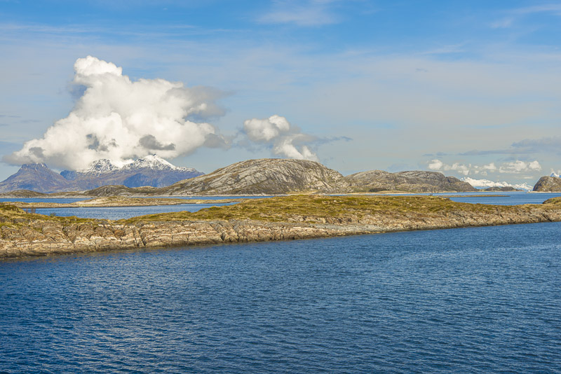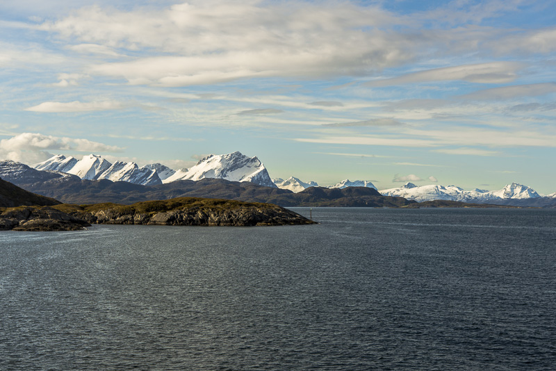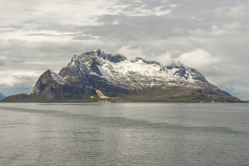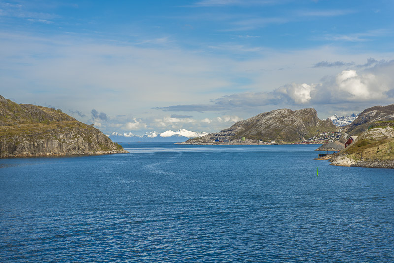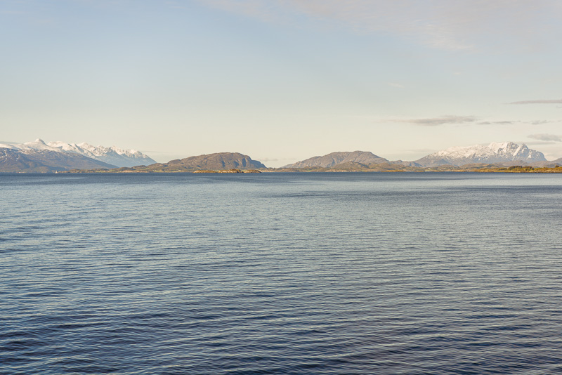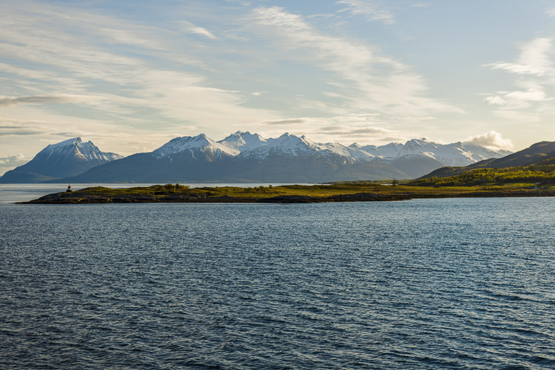 Der Blick nach Norden durch eine Lücke, die wir später befahren werden, geht hier bis zu den schneebedeckten Bergen der Lofoten. Die Sichtweite ist heute 120 km.