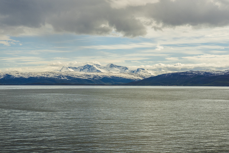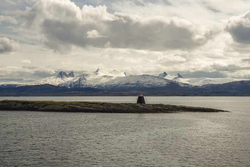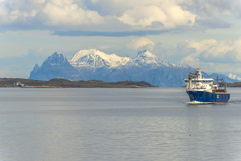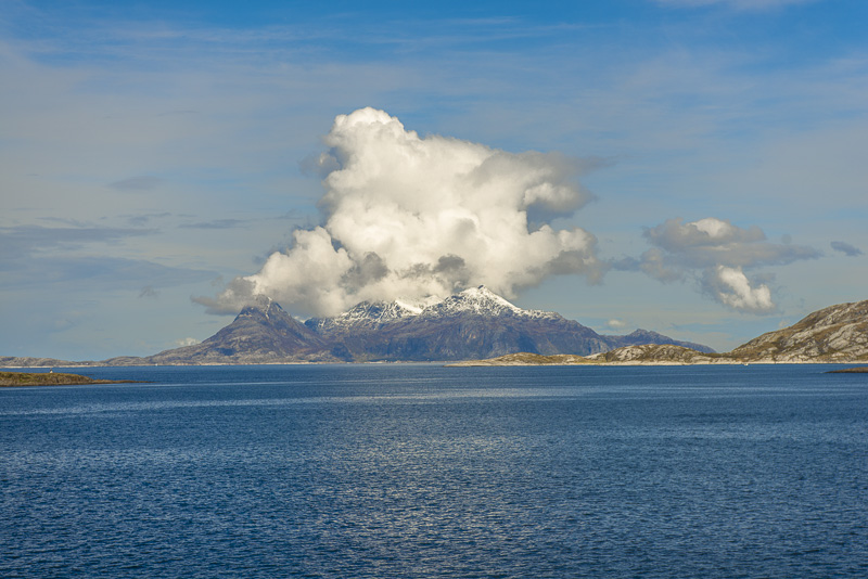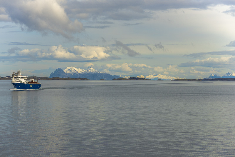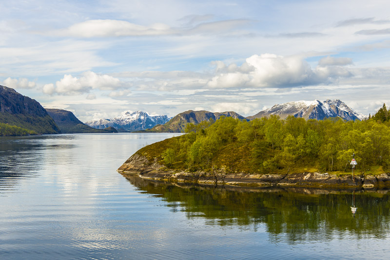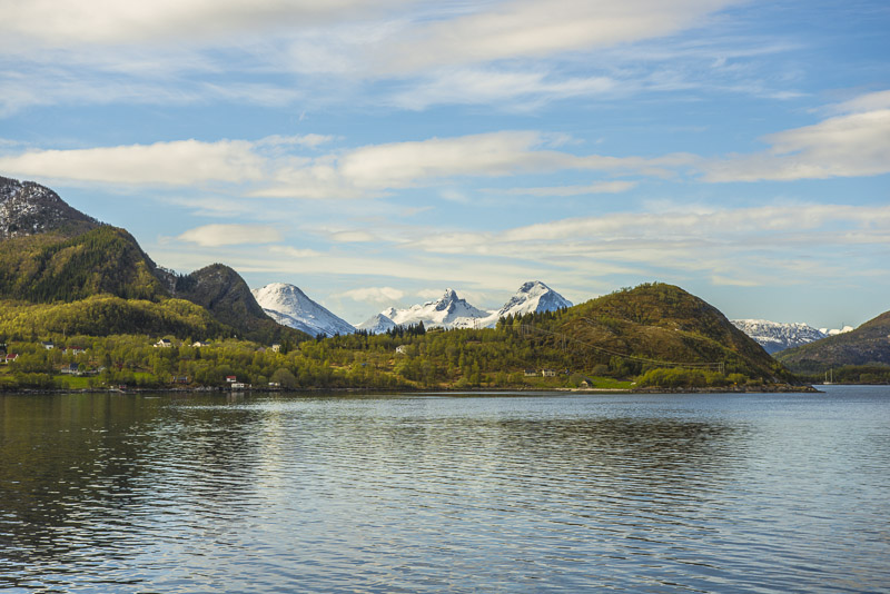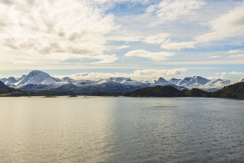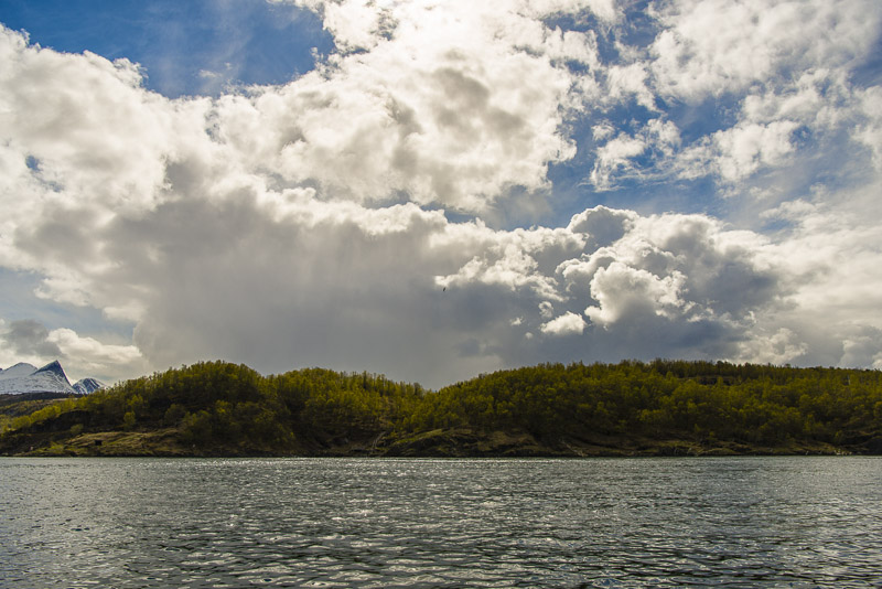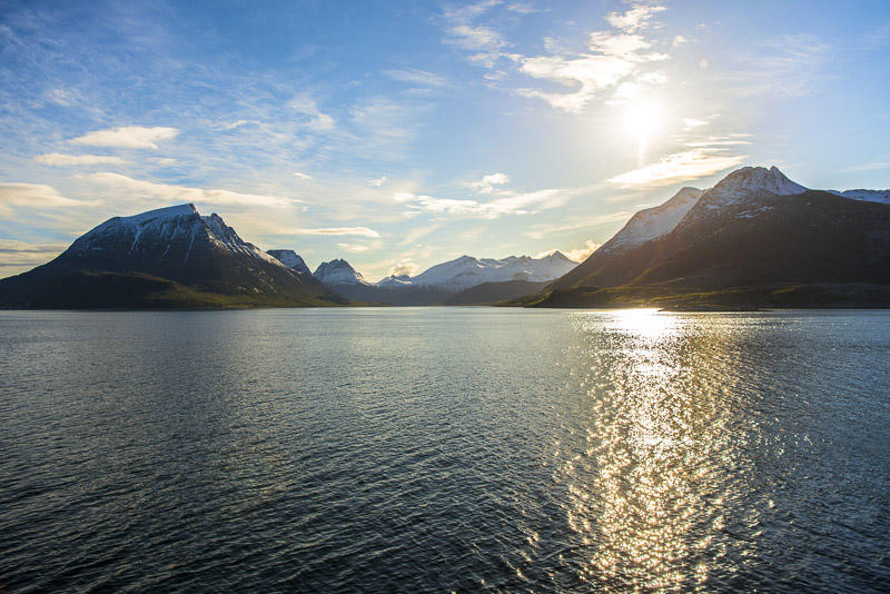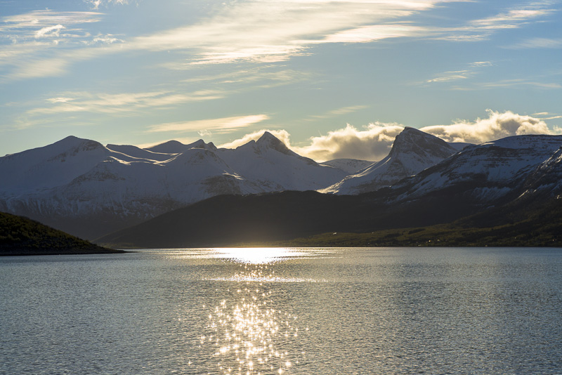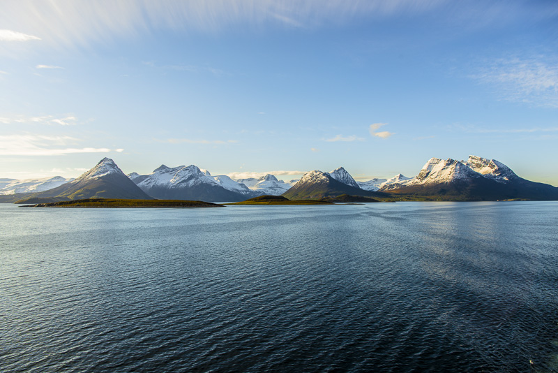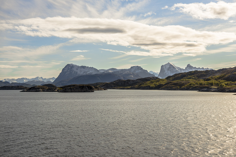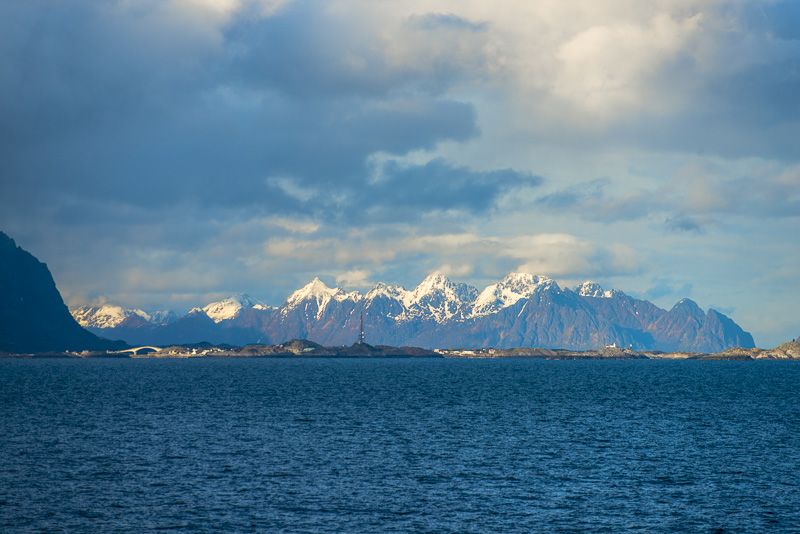 Der Blick nach Norden durch eine Lücke, die wir später befahren werden, geht hier bis zu den schneebedeckten Bergen der Lofoten. Die Sichtweite ist heute 120 km.