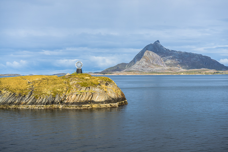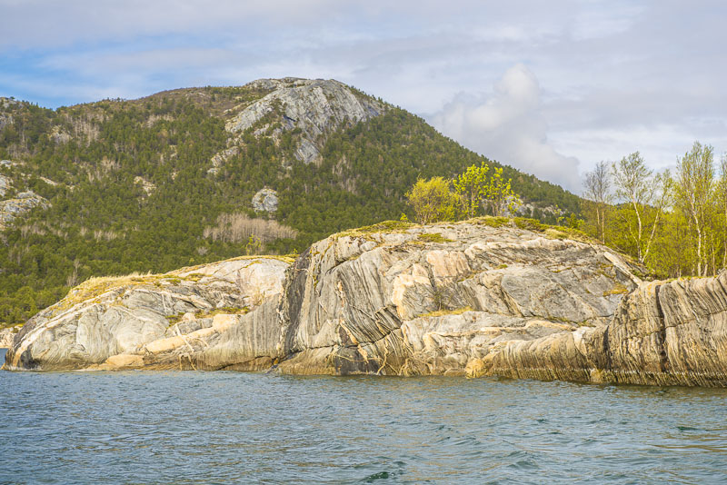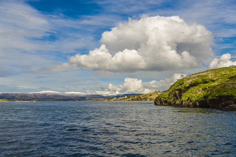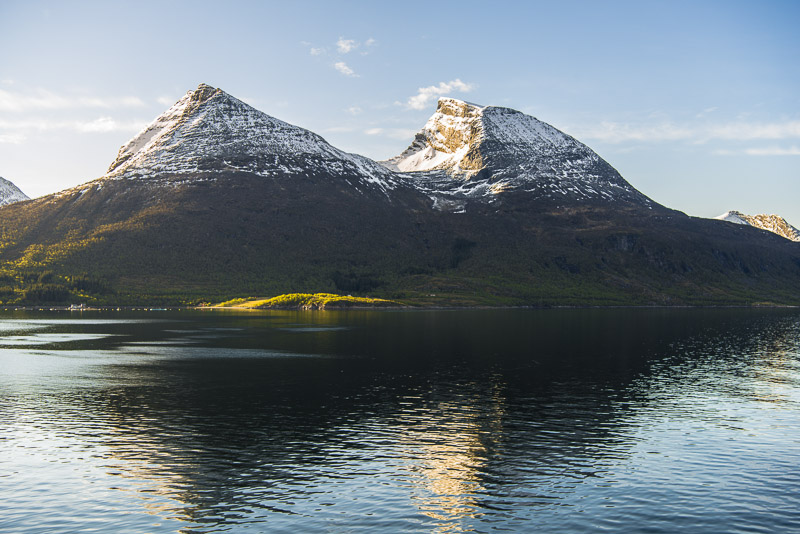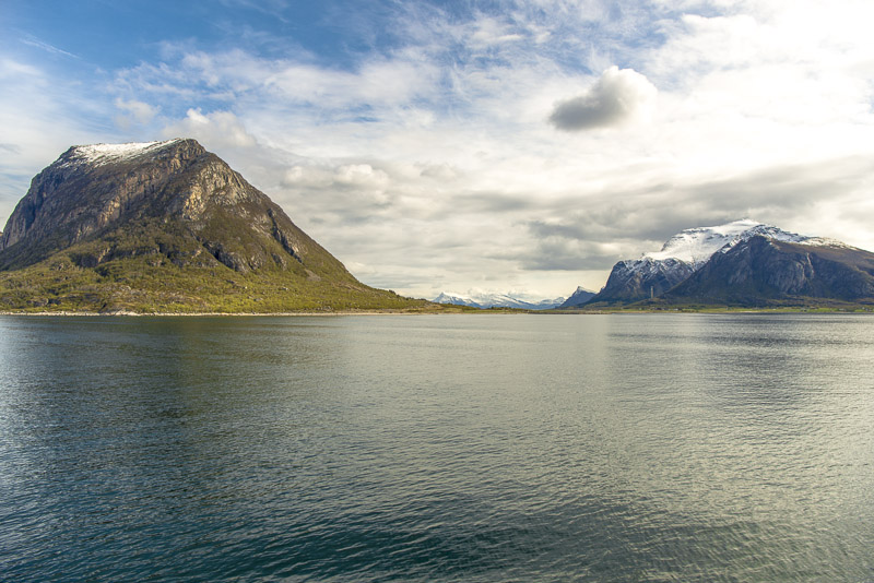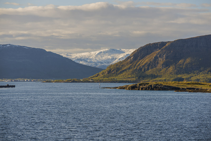 Links der 599 m hohe Kunna, um den wir herumfahren müssen. In der Lücke am Horizont bereits Berge jenseits von Bodø.