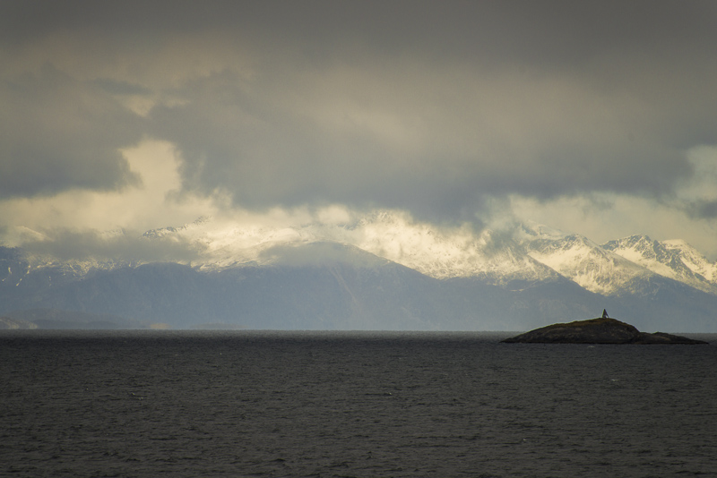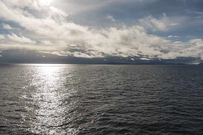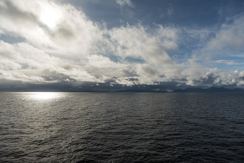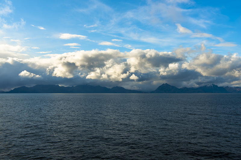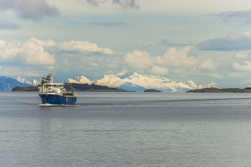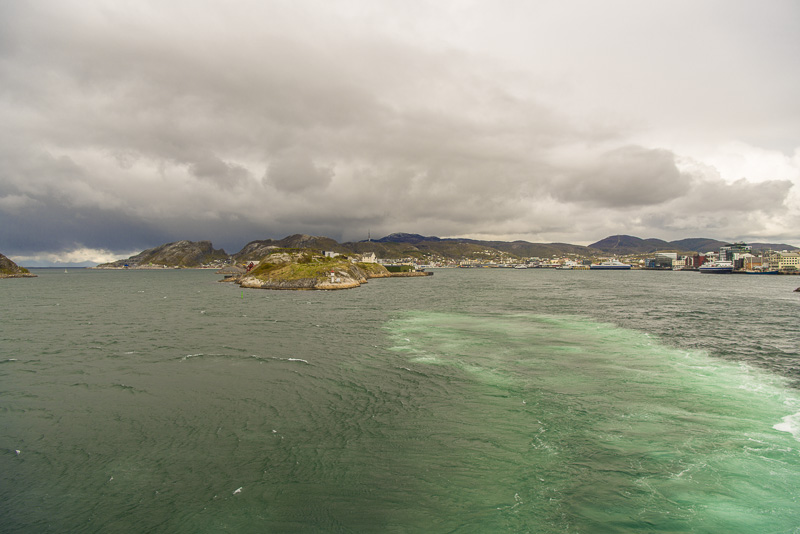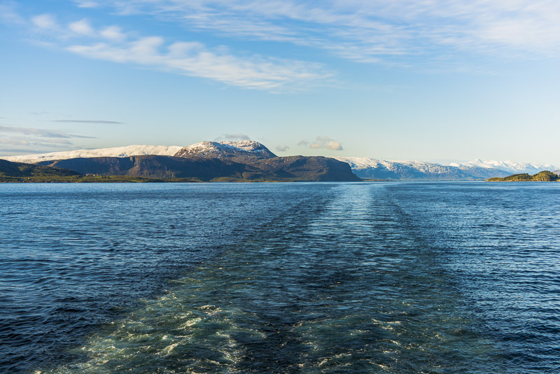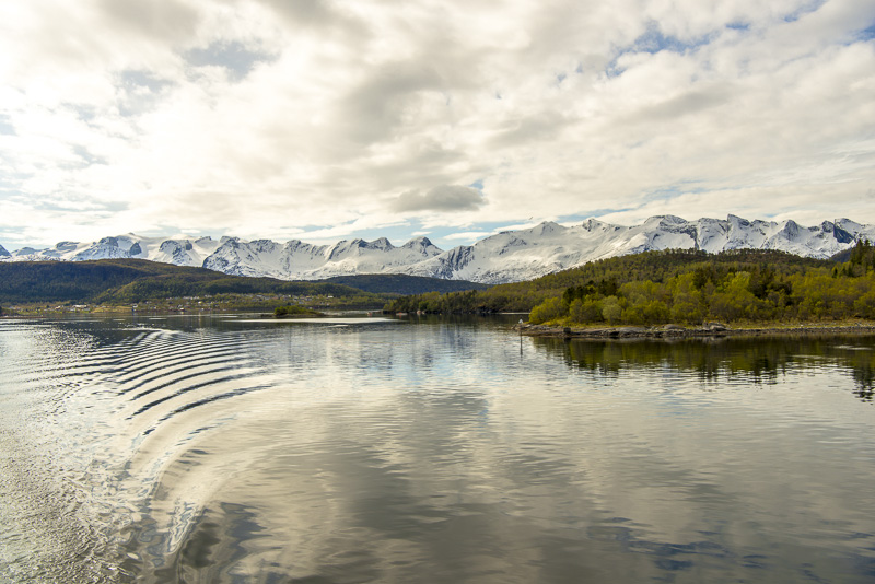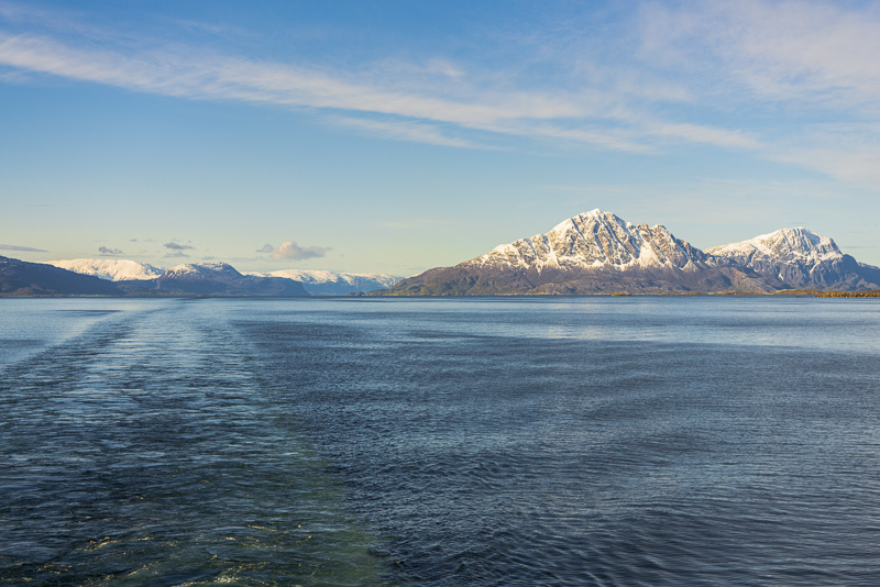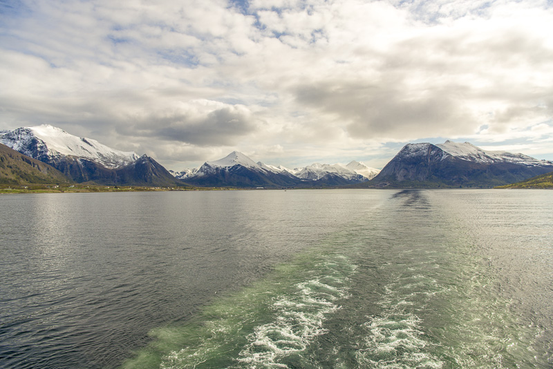 Blick zurück - die ferne Bergkette links sind die "7 Schwestern" von Sandnessjøen (dort haben wir um 3:45 angelegt).