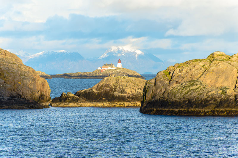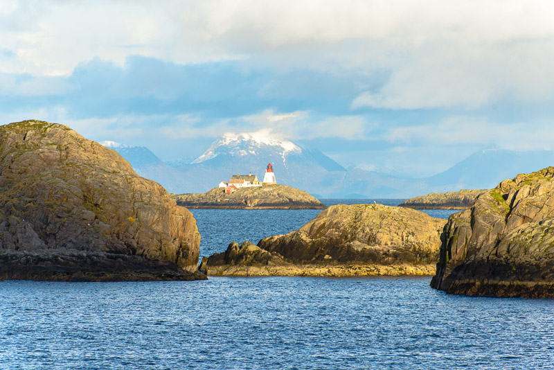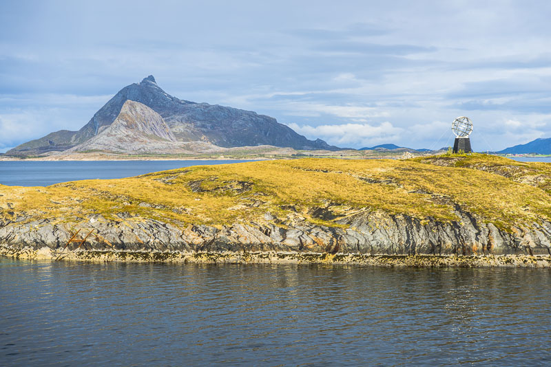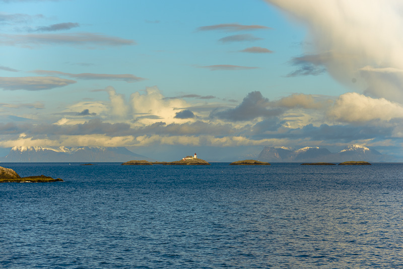 Blick nach Westen. Auch auf den Inseln noch hohe Berge: Meløytinden (582 m) auf der Insel Meløy.