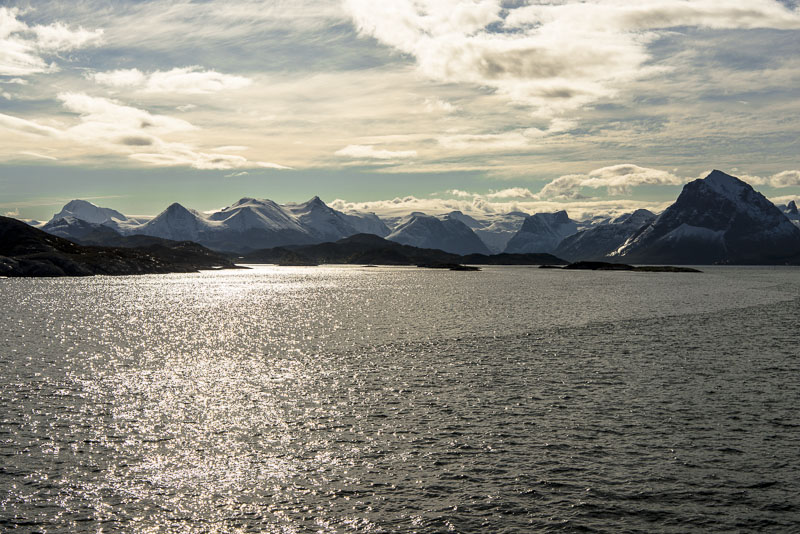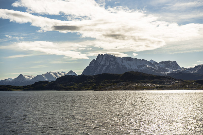 Der Blick zurück geht bis zu den über 1.000 m hohen Bergen der Halbinsel Meløy.