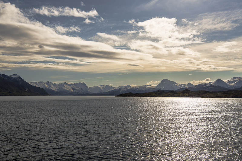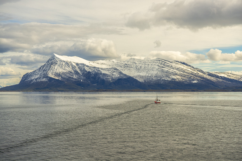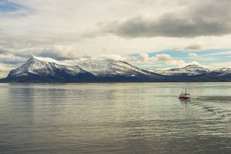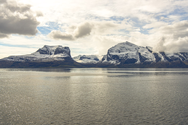 Es geht wieder los: vor der Bergkette fädeln wir uns nach rechts ein Richtung Tomfjorden.