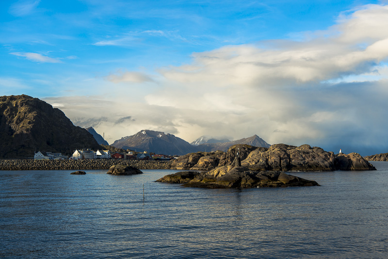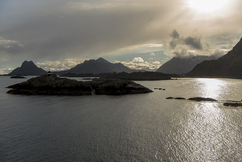 Blick zurück Richtung Stamsund, im Gegenlicht der tief stehenden Sonne.