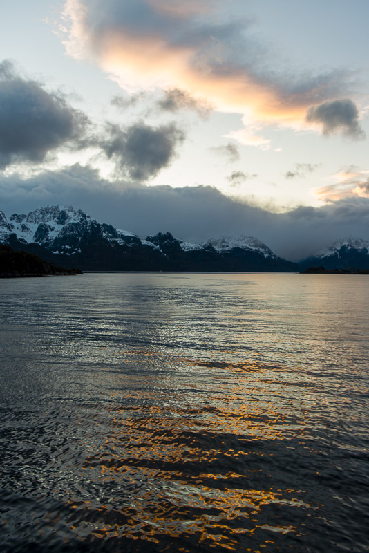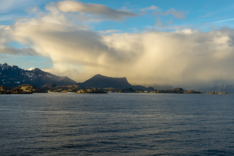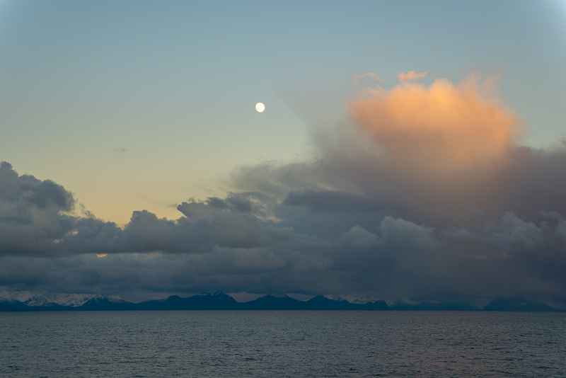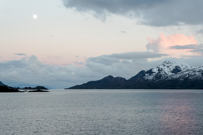 Nach der Abfahrt aus Svolvær ist das Licht jetzt schon viel schwächer geworden, aber die Wolken sind immer noch erleuchtet.