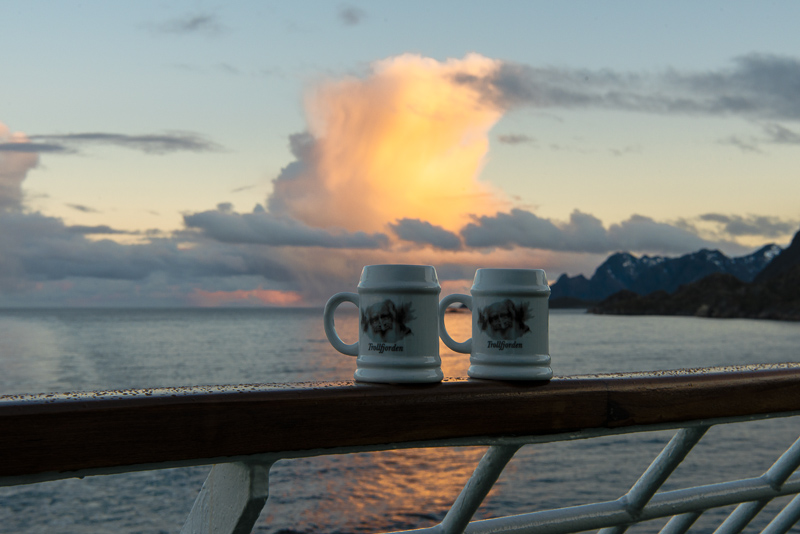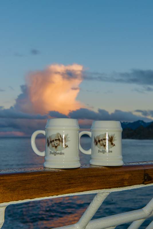 Wir fahren jetzt in den extrem engen Trollfjord, und zur Feier des Tages gibt es Tee mit Rum - die Krüge dürfen wir behalten.
