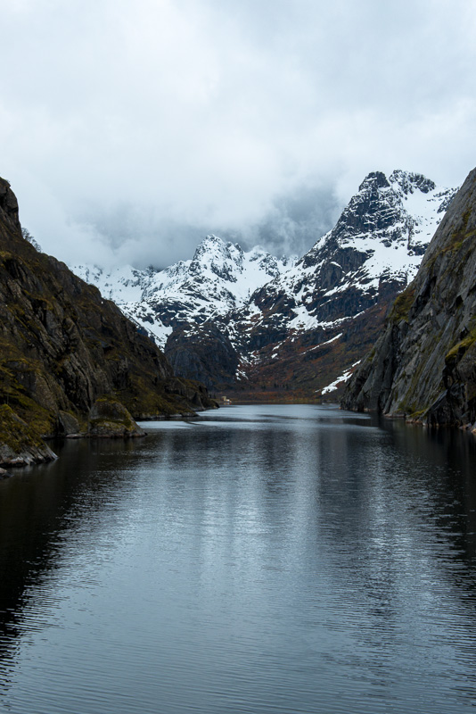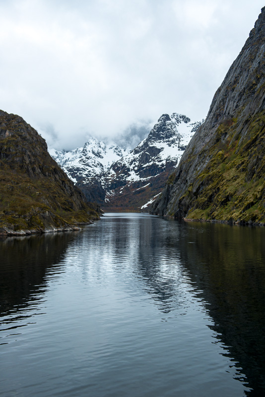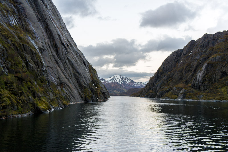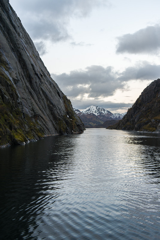 Dieser enge, aber in der Mitte überall zumindest 30 m tiefe Fjord ist eingebettet zwischen hohe Felswände.
