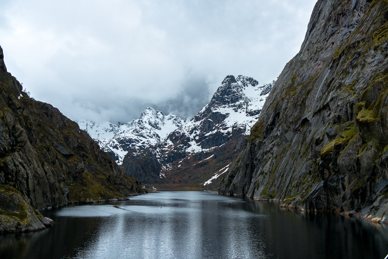 Am Ende ragen Berge bis in 830 m Seehöhe auf (Trollfjordtindan)