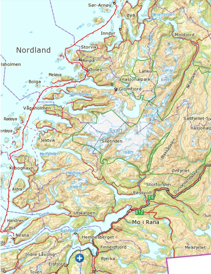 Der einzige sichere Anhaltspunkt ist der riesige Plateaugletscher am Horizont - der Svartisen - Gletscher mit Gipfeln bis über 1.500 m Höhe. Am Polarkreis und bei den häufigen Niederschlägen der Gegend ausreichend, um Gletscher zu erhalten.