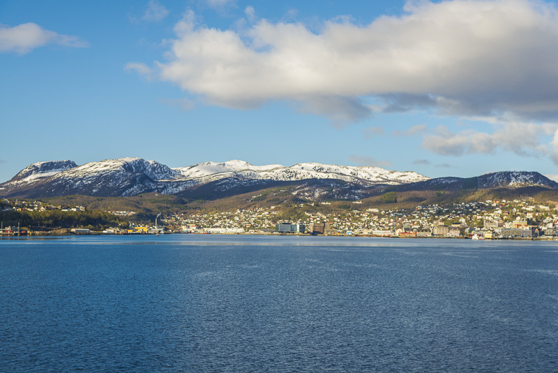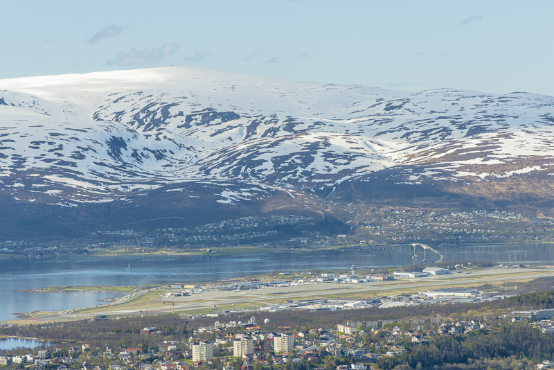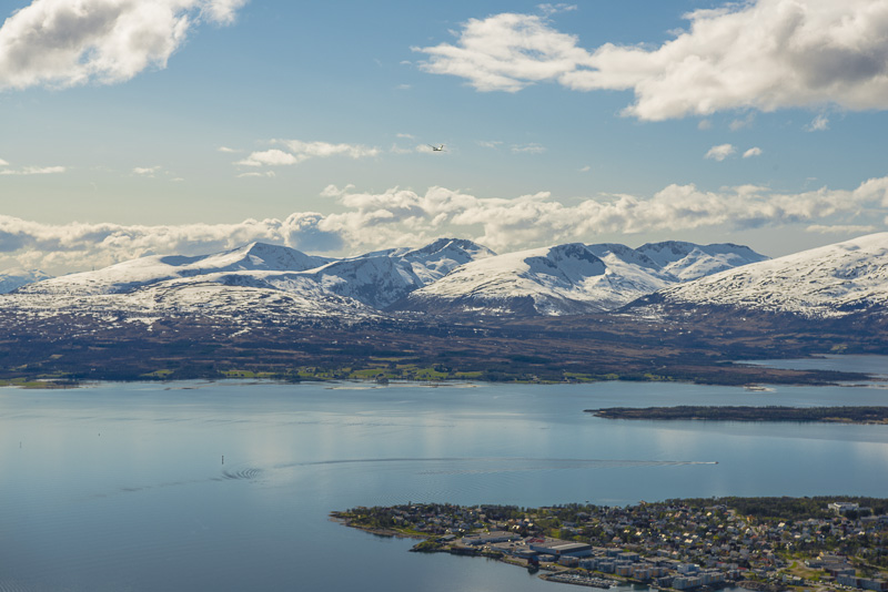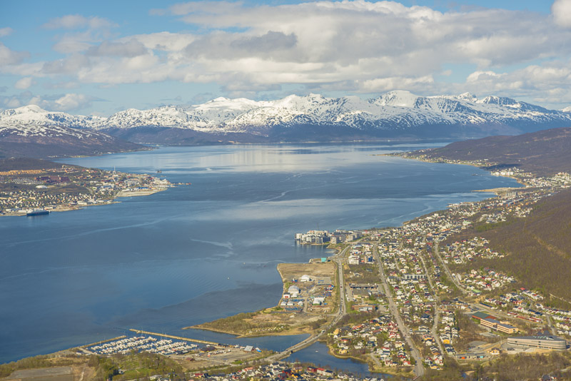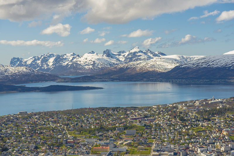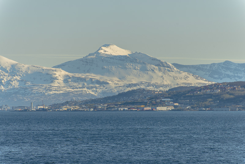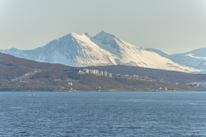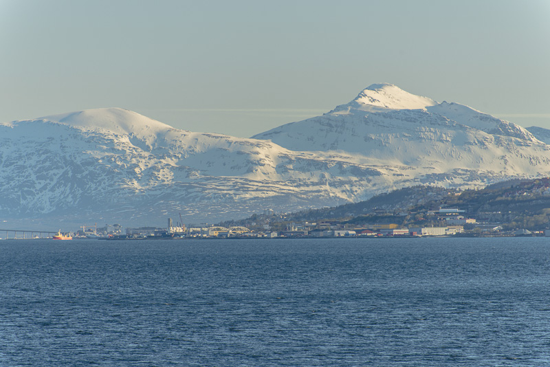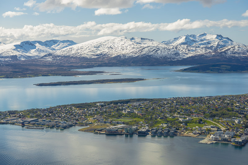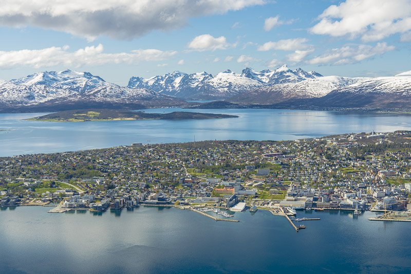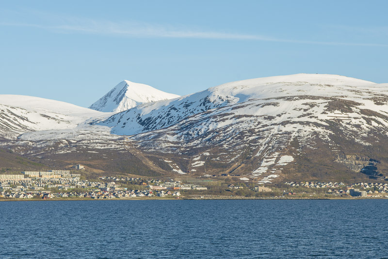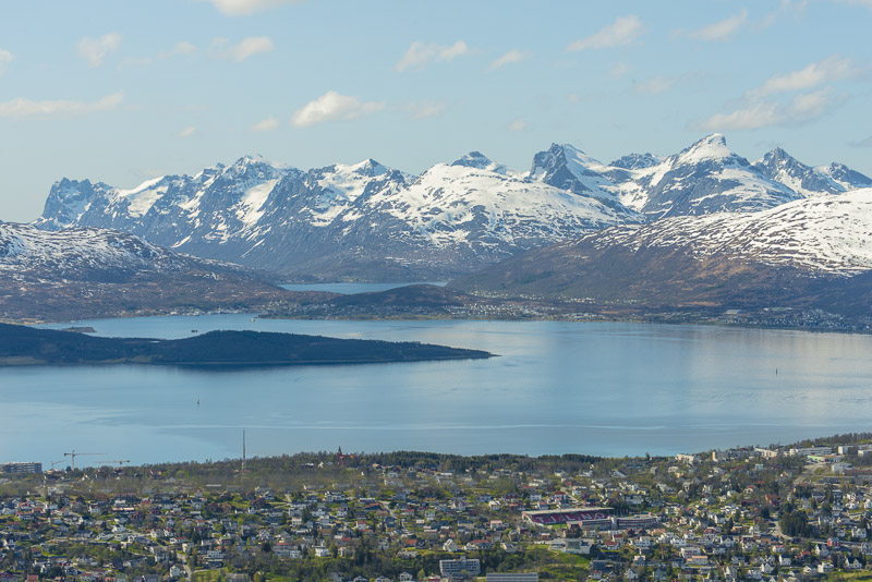 Tromsø, dahinter die Berge der Insel Kvaløya, die meisten mehr als 900 m hoch, mit dem Skittentinden (1.042 m) und dem Store Blåmann (1.044 m) als höchsten