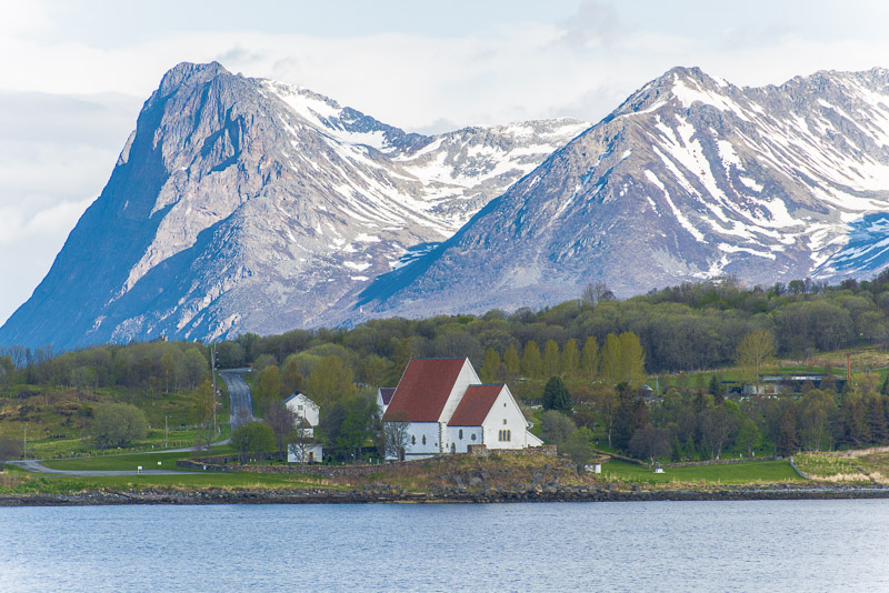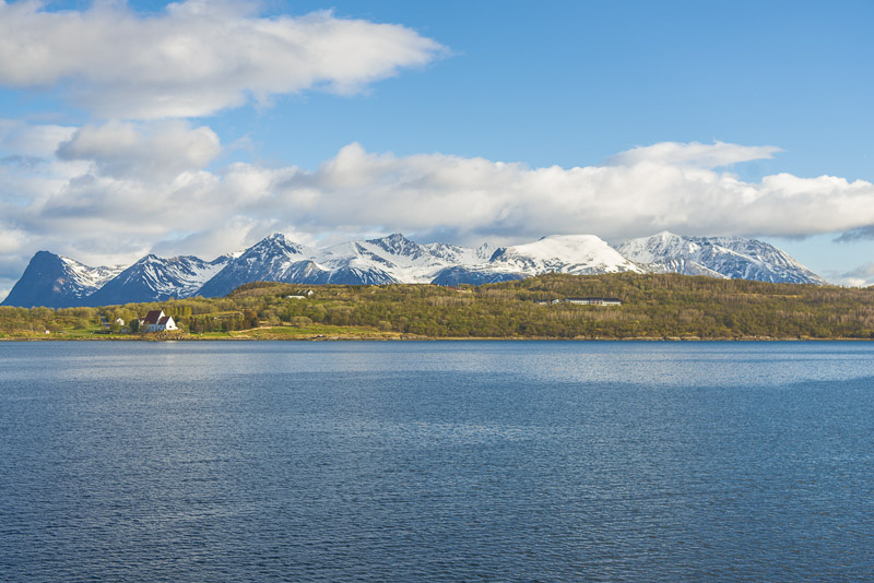 Hinter der schmalen und niedrigen Landzunge die Insel Grytøya mit Bergen bis über 1.000 m Seehöhe. Links im Vordergrund die Trondenes - Kirche.