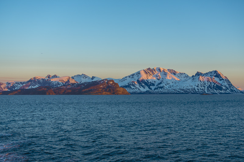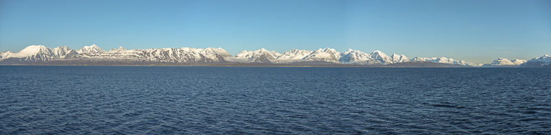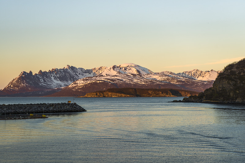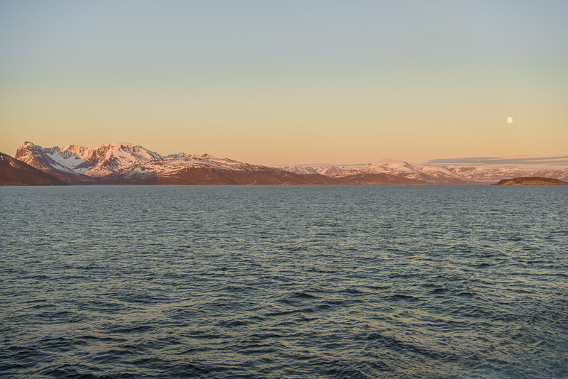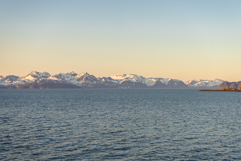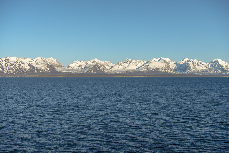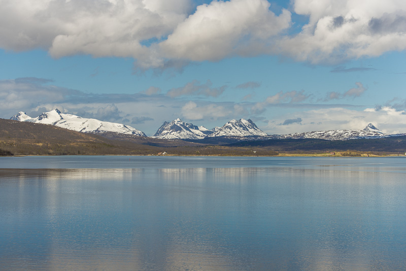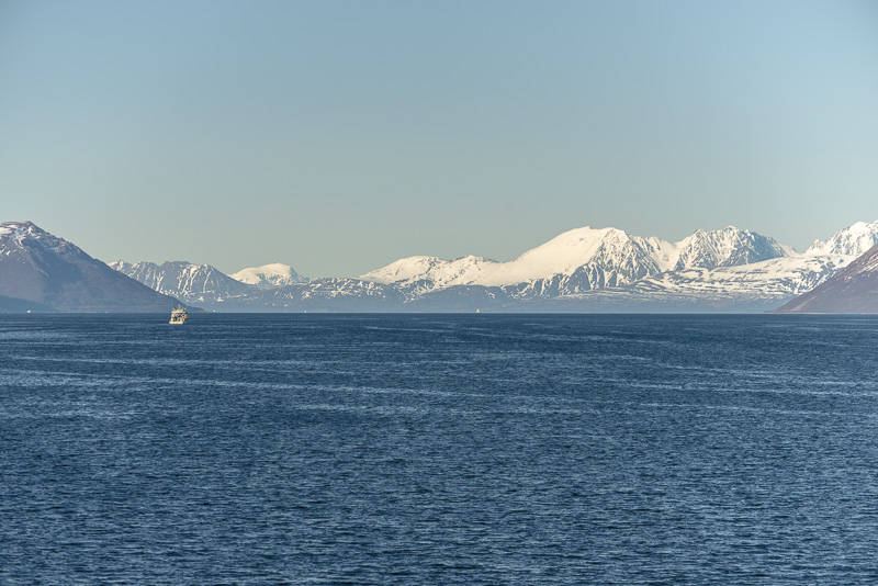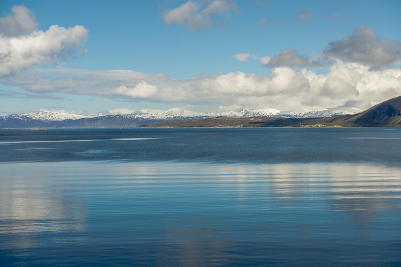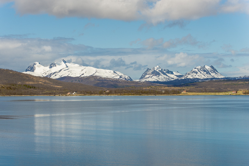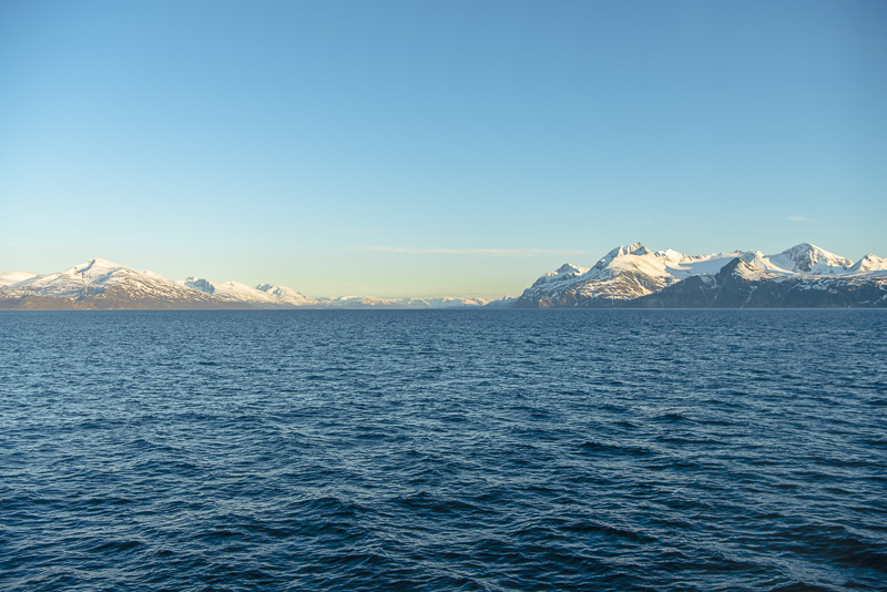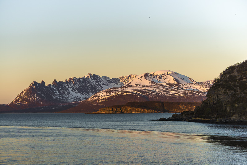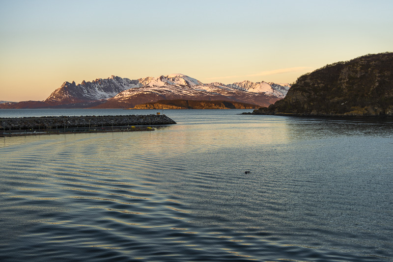 Jetzt ist das Wasser wieder einmal extrem glatt. In der Ferne im Westen die Berge der Insel Senja.