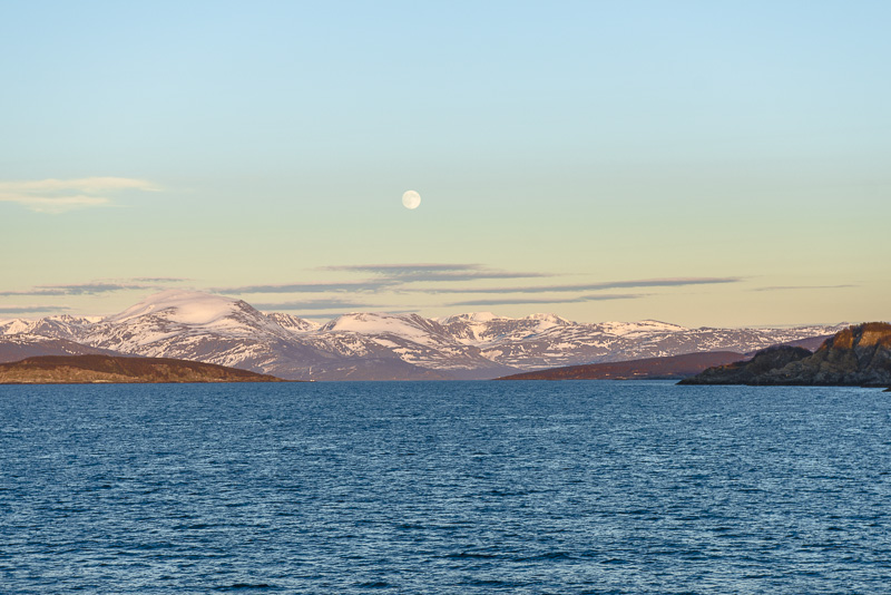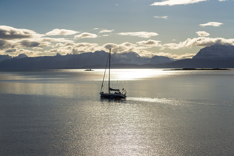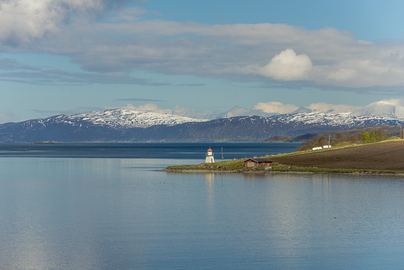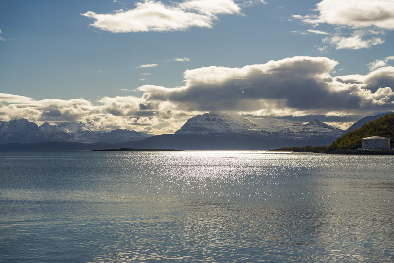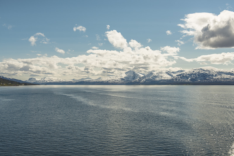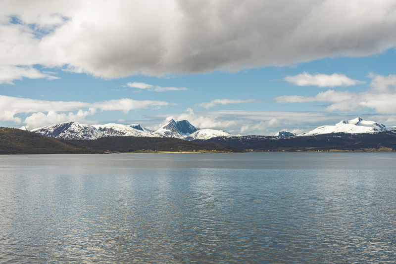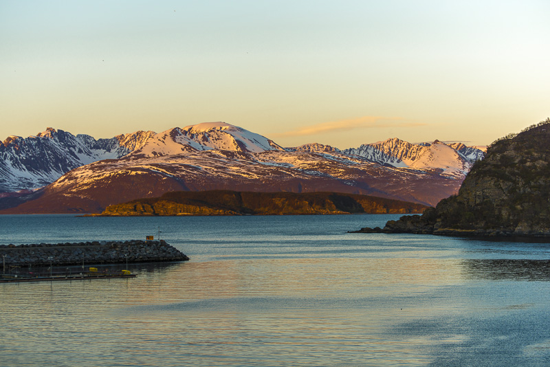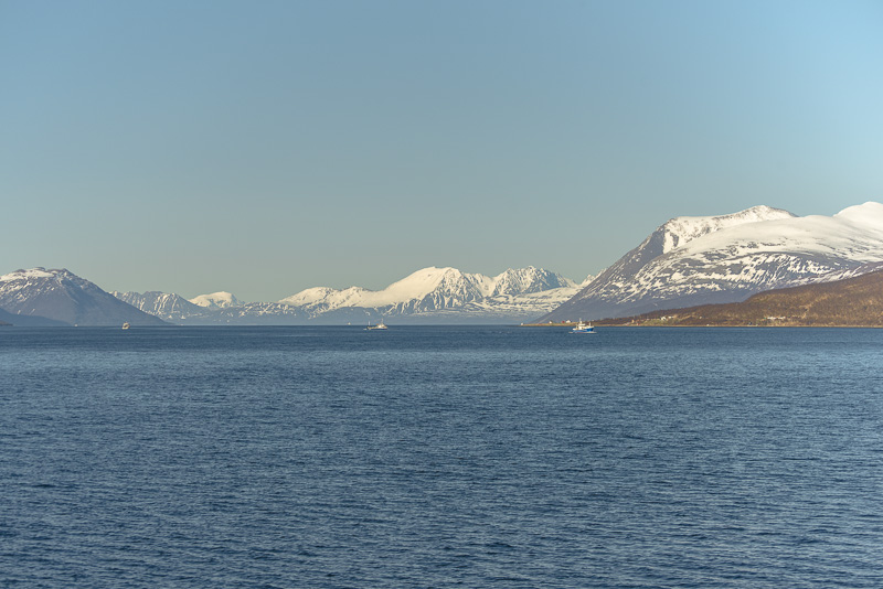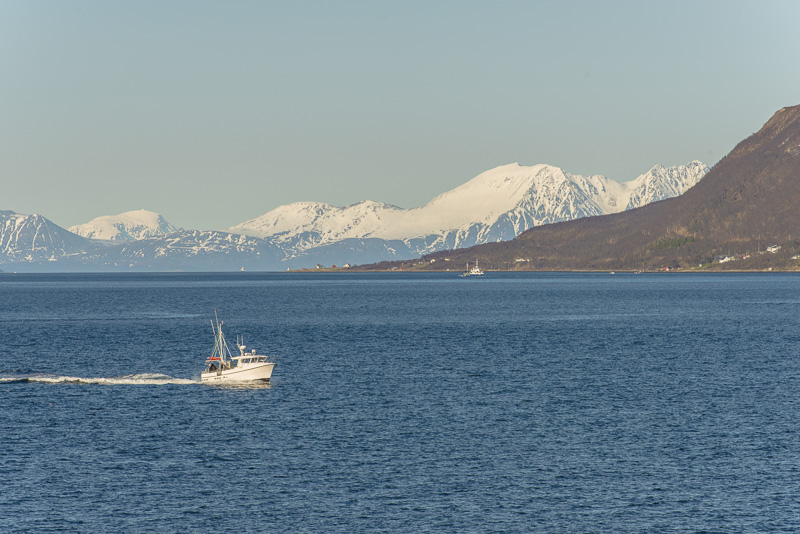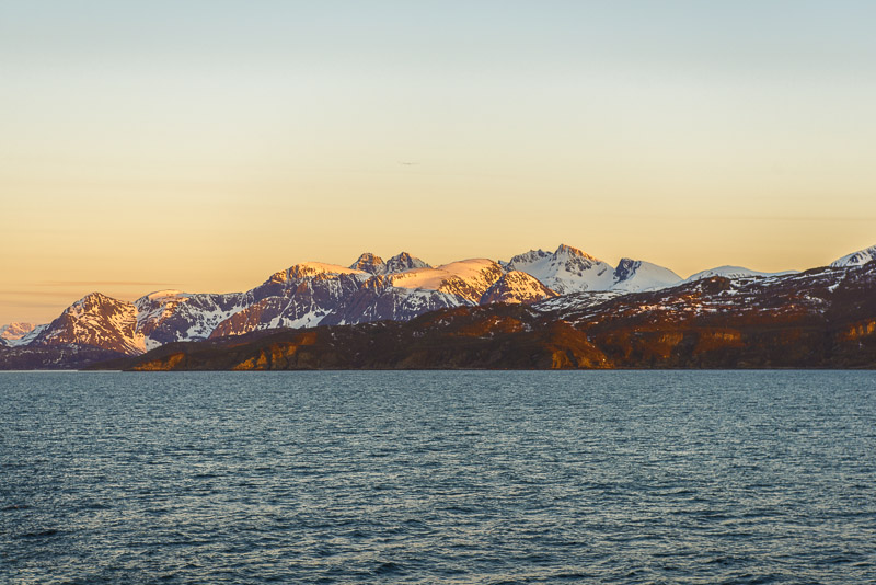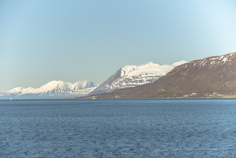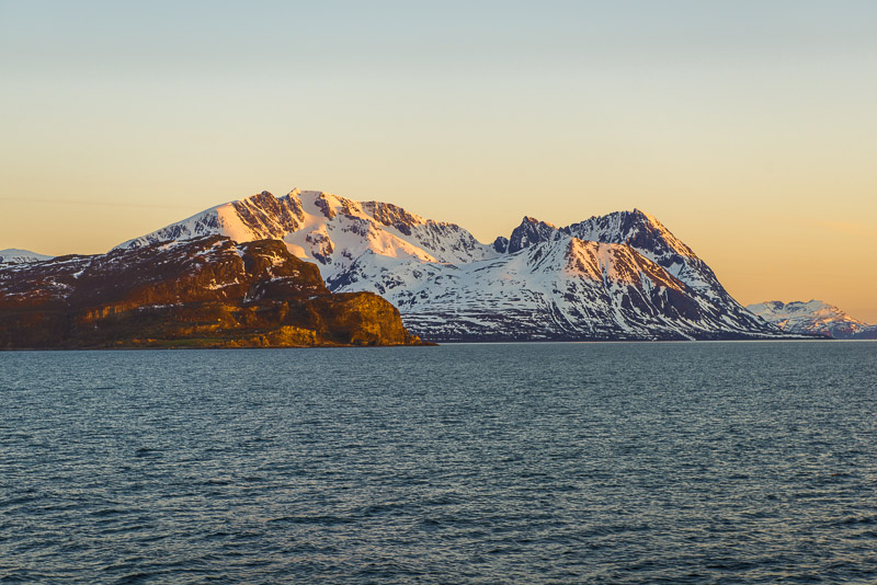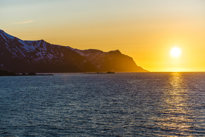 Jetzt ist das Wasser wieder einmal extrem glatt. In der Ferne im Westen die Berge der Insel Senja.