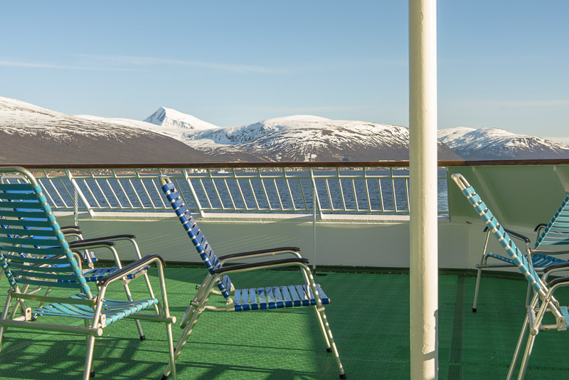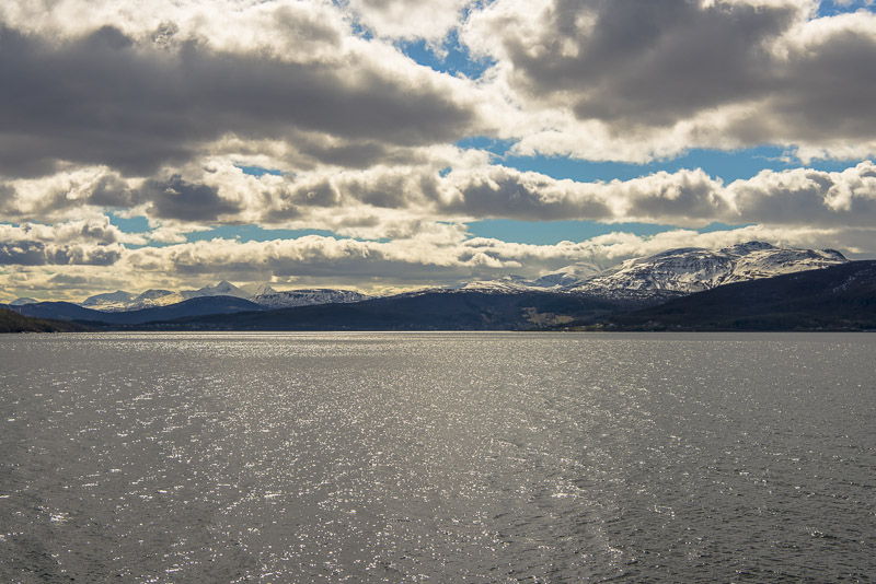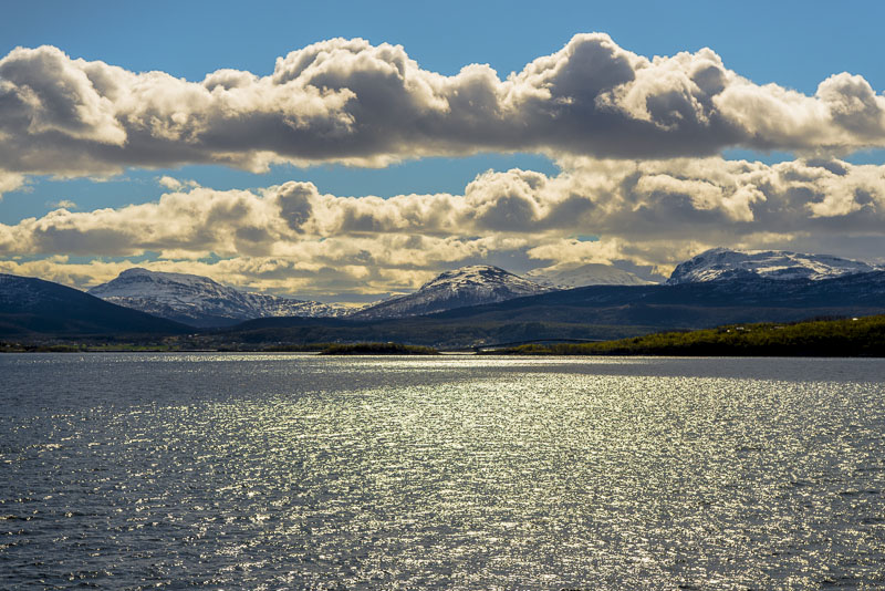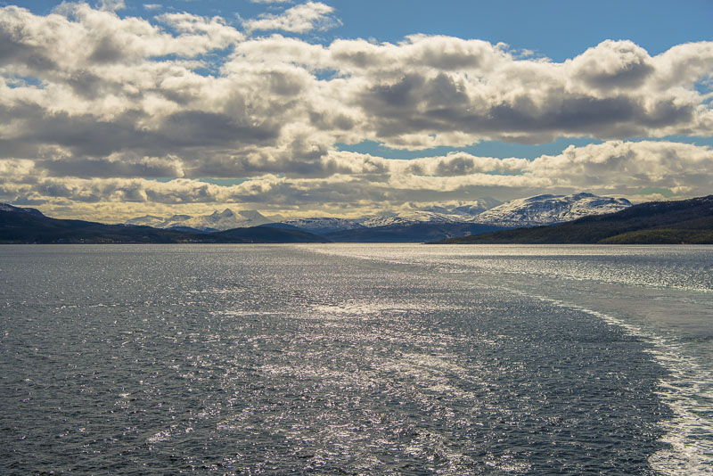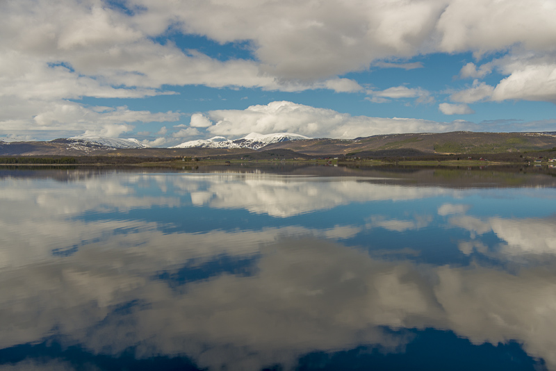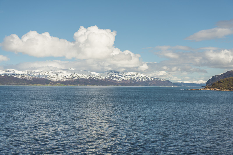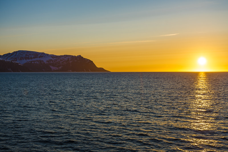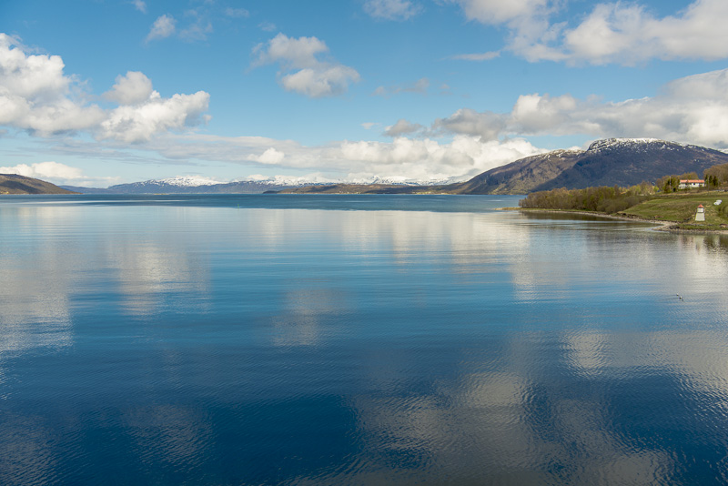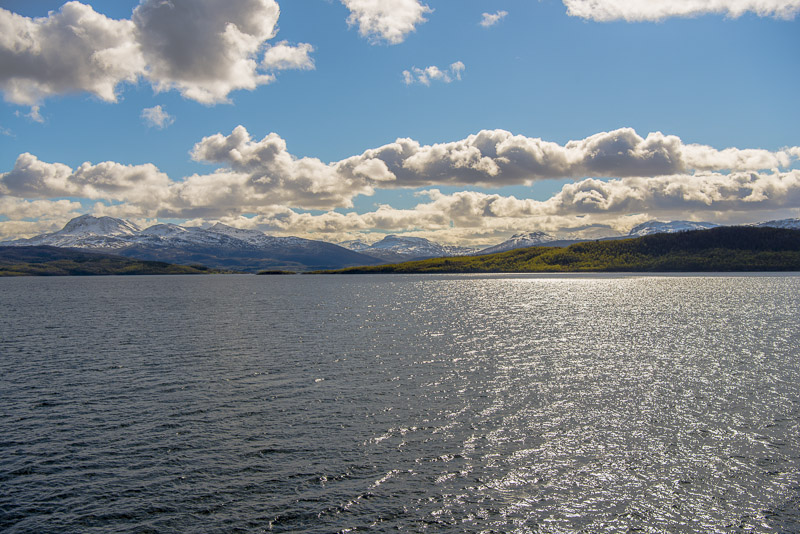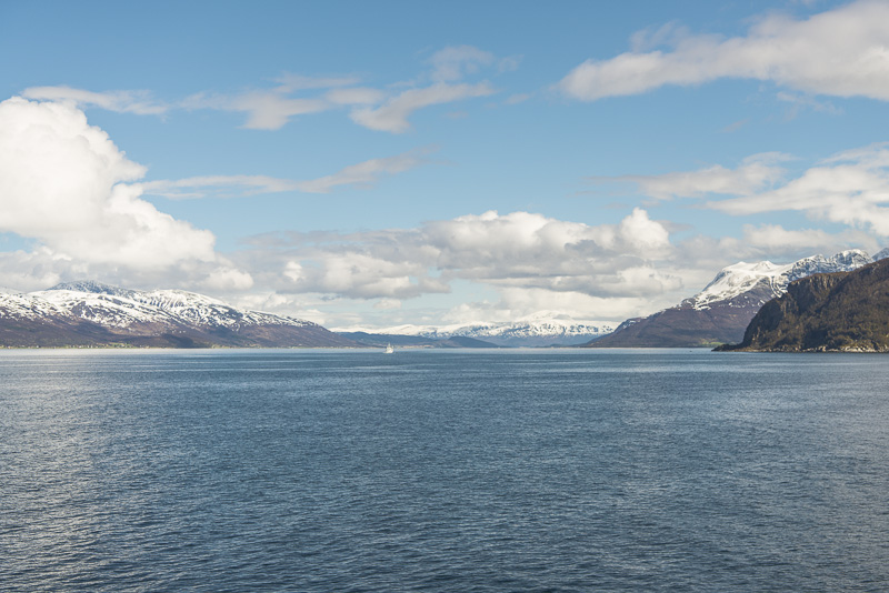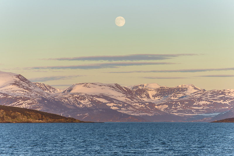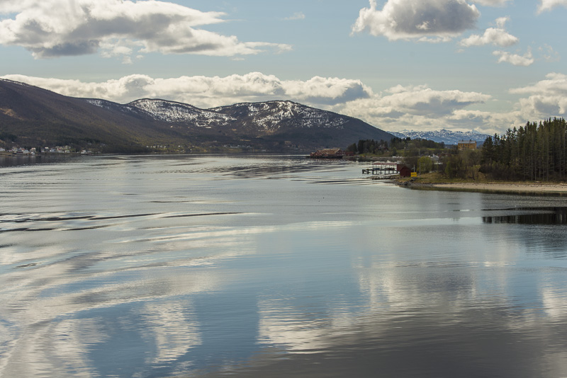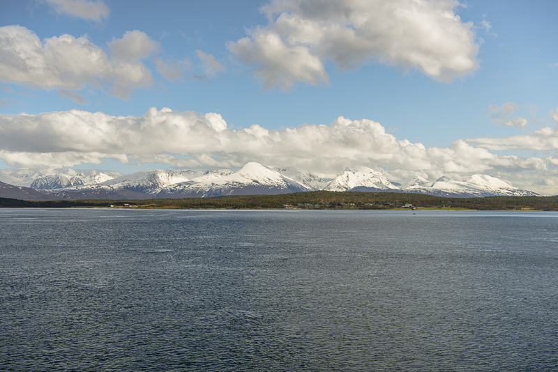 Jetzt ist das Wasser wieder einmal extrem glatt. In der Ferne im Westen die Berge der Insel Senja.