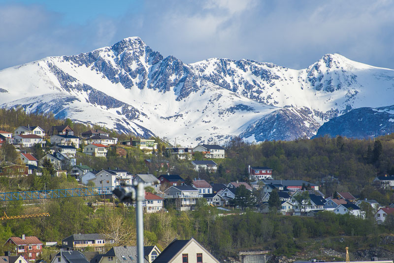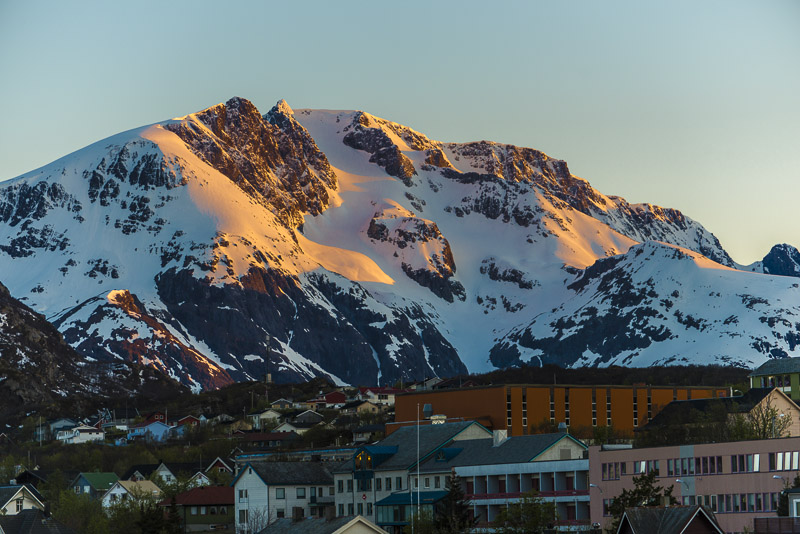 Harstad aus der Ferne, dahinter der Middagstfjellet.