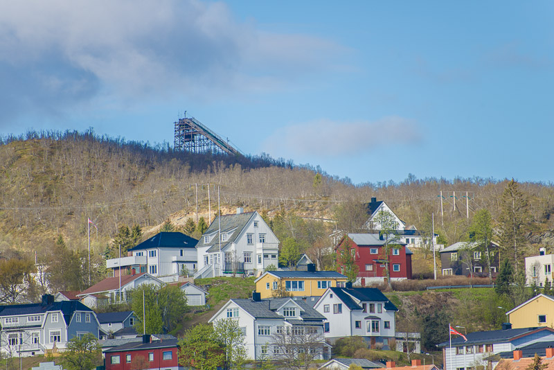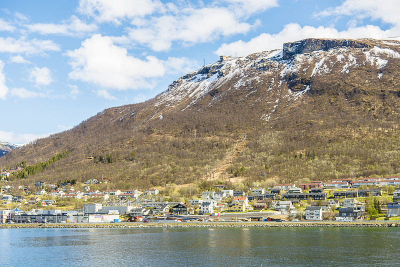 Harstad, dahinter die Berge um den Sollifjellet (567 m), im Winter durch einen Schilift erschlossen.