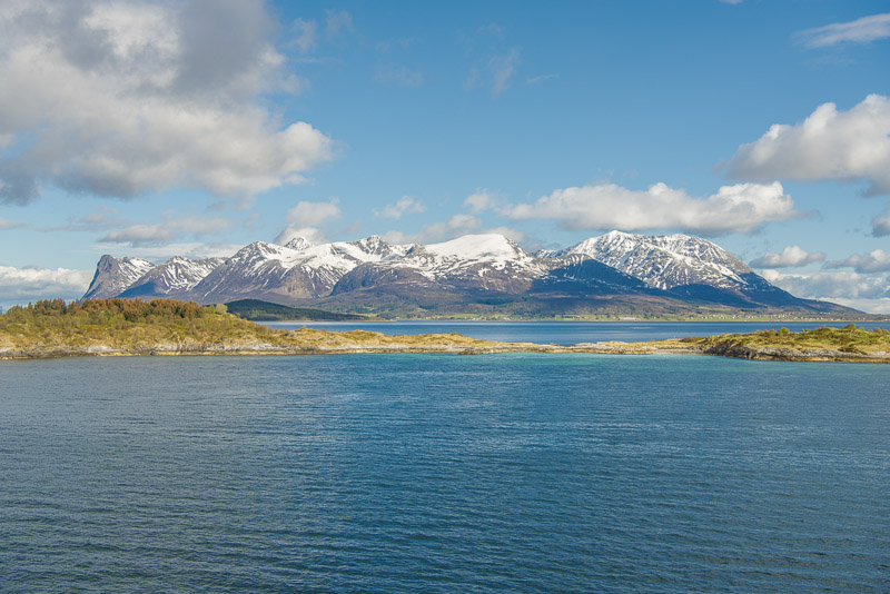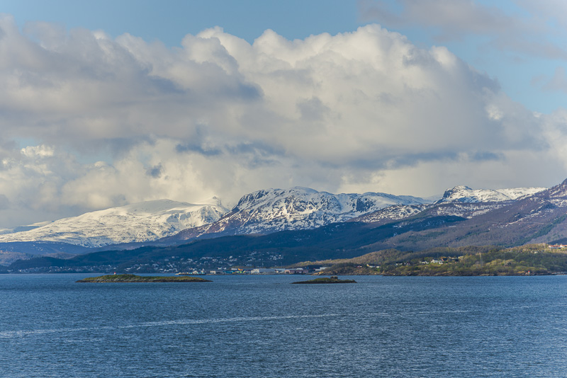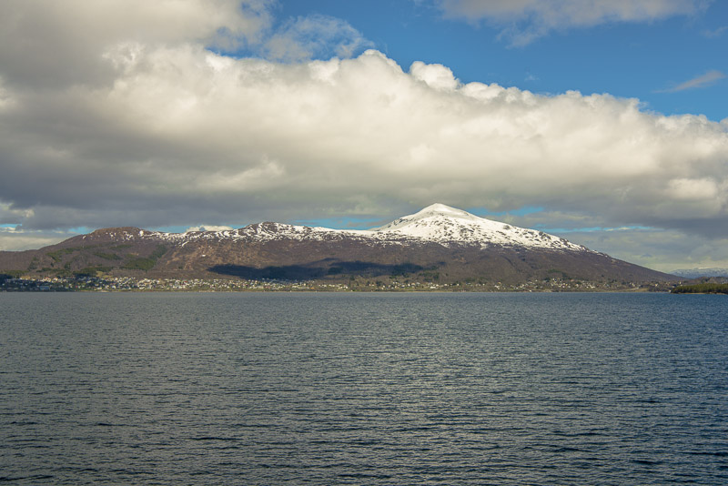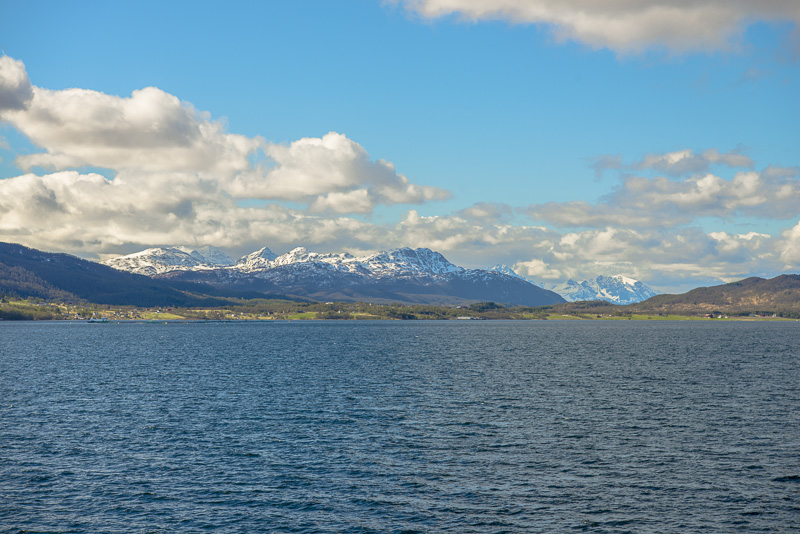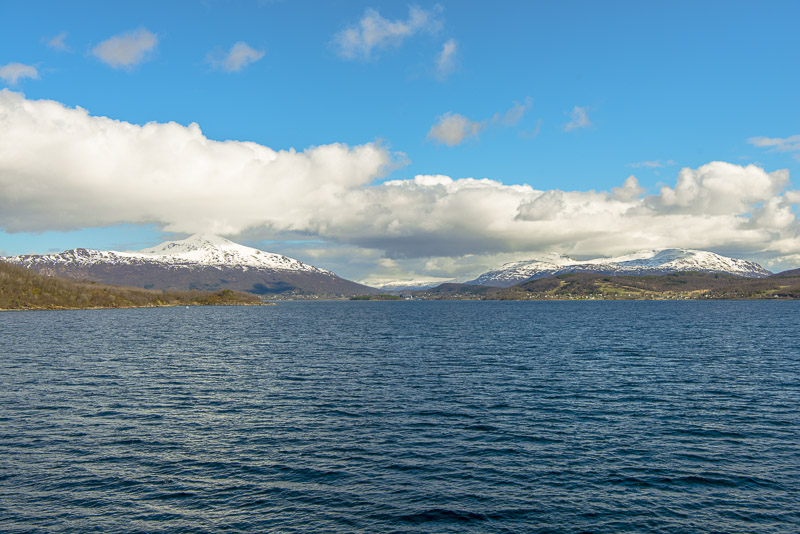 Auf die andere Seite geht der Blick über den Vågsfjorden zur Insel Rolla, ebenfalls mit Bergen bis über 1.000 m.