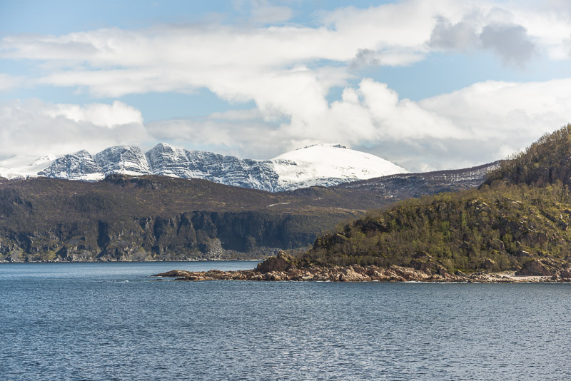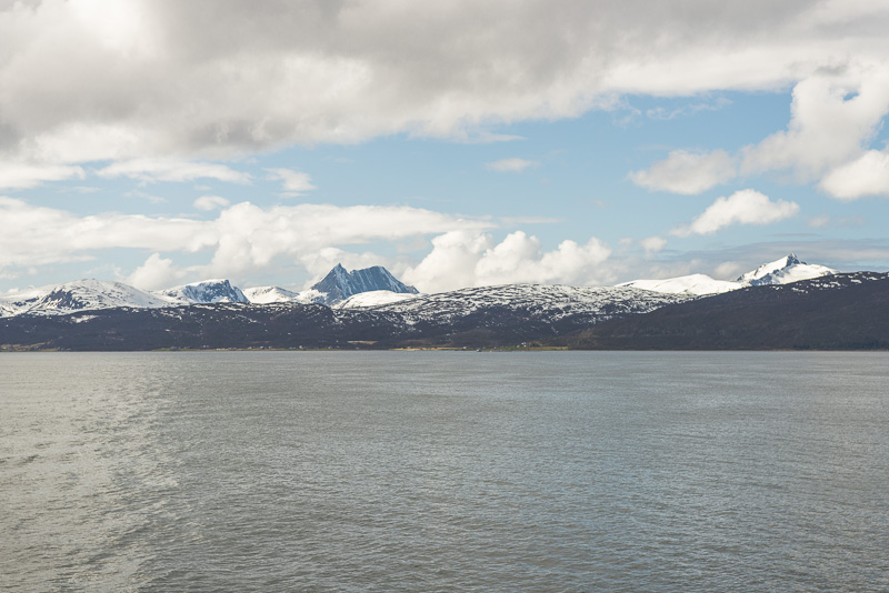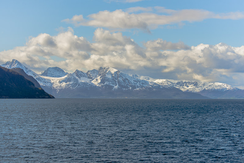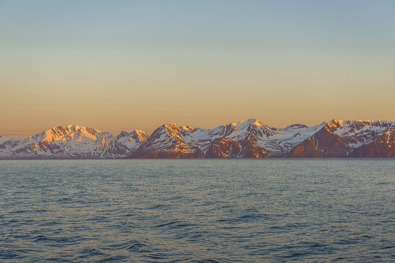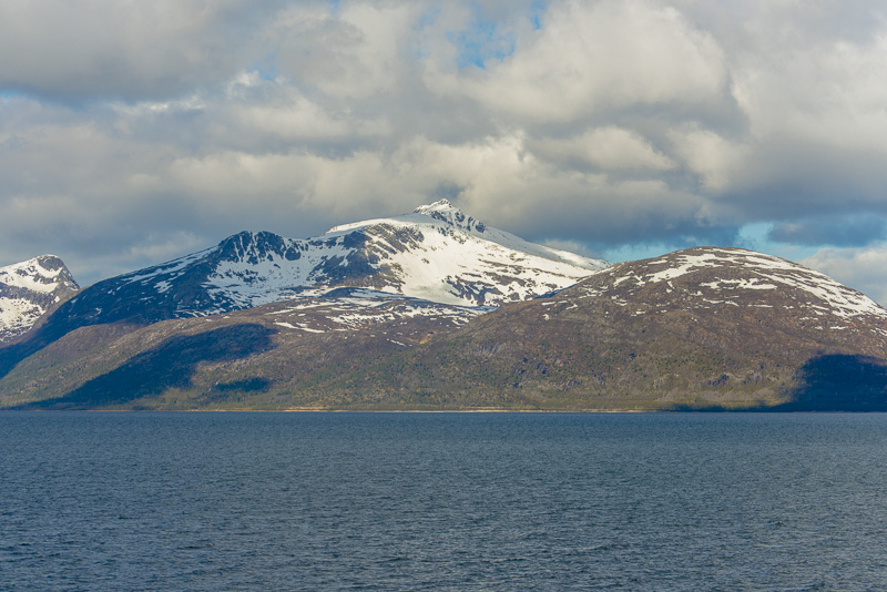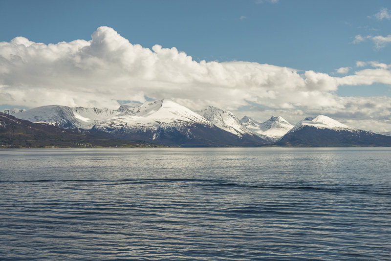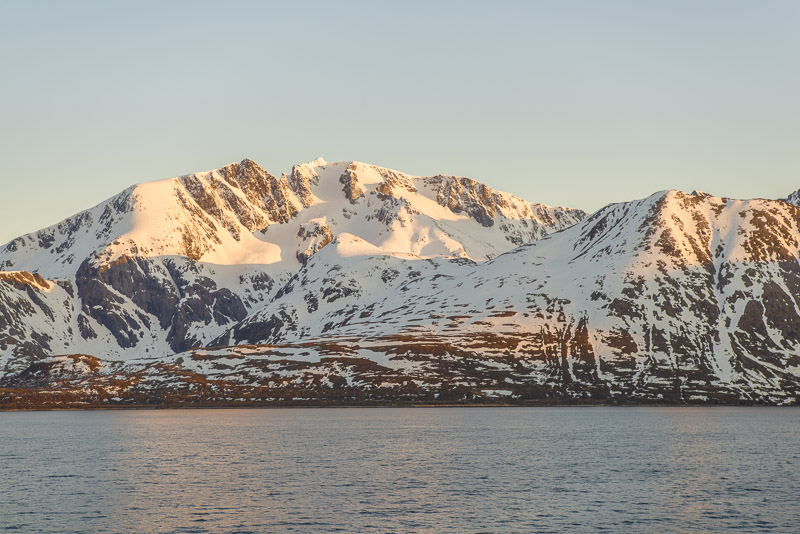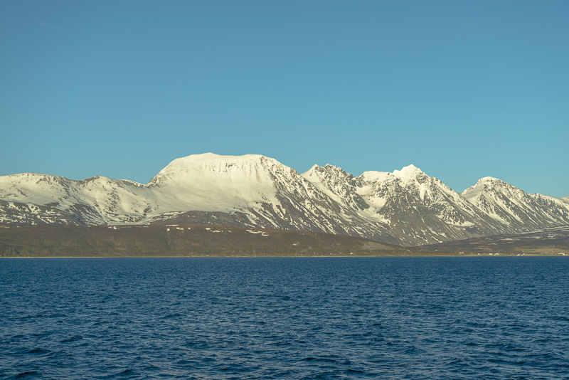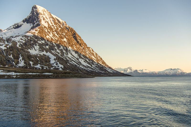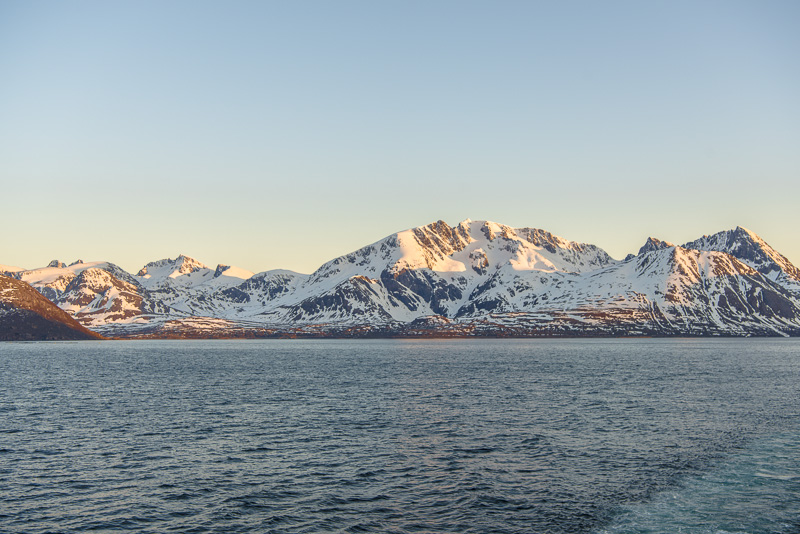 Noch sind wir aber auf dem Meer unterwegs. Blick zurück zum Bentsjordtinden (1.168 m) und seinen Nachbarn, die meisten über 1.000 m hoch.