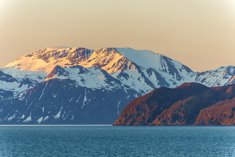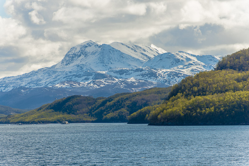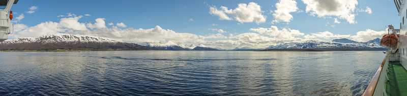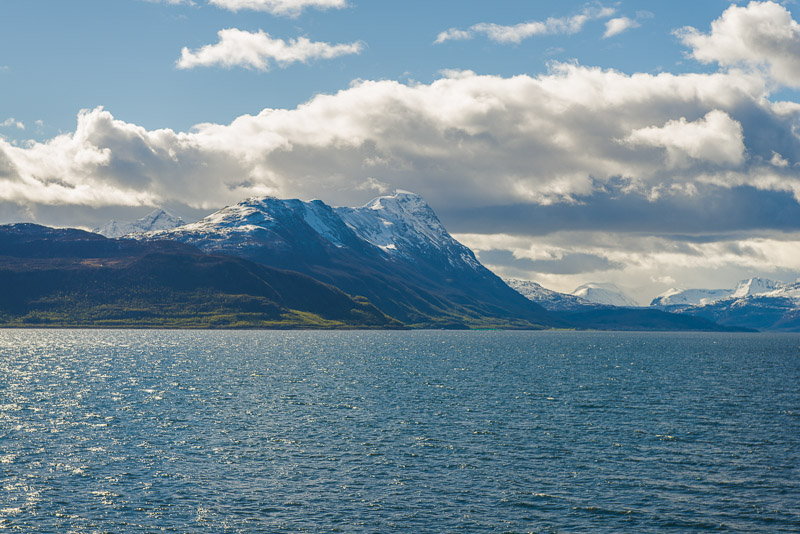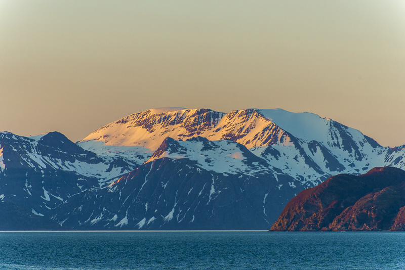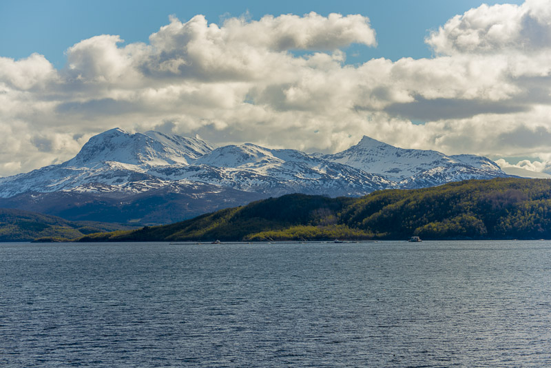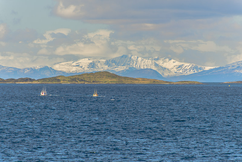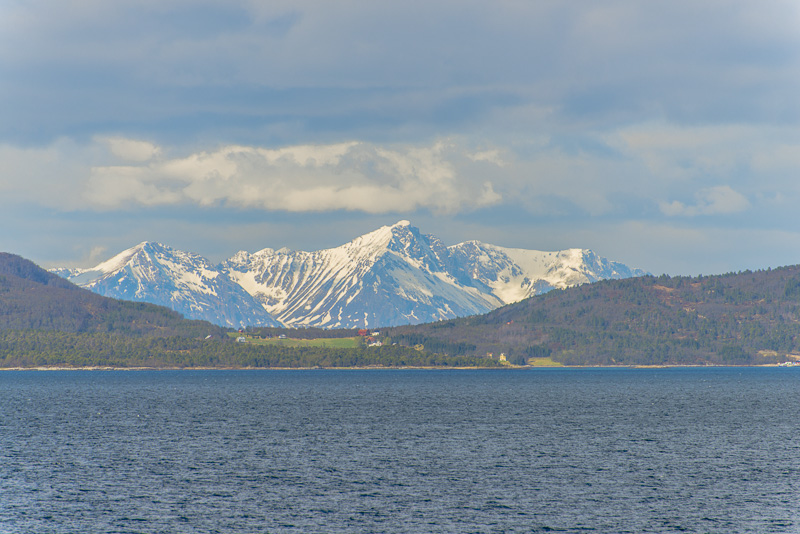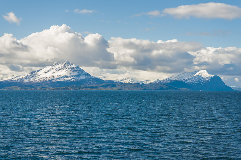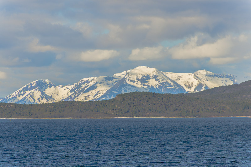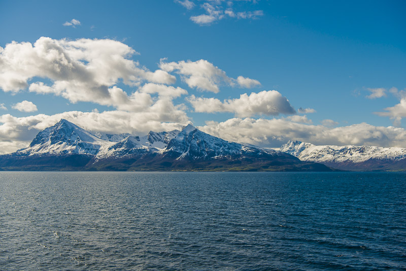 Noch sind wir aber auf dem Meer unterwegs. Blick zurück zum Bentsjordtinden (1.168 m) und seinen Nachbarn, die meisten über 1.000 m hoch.