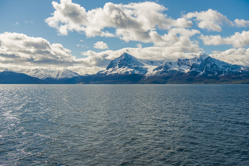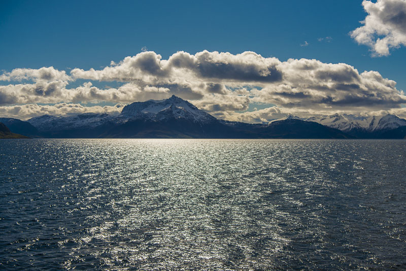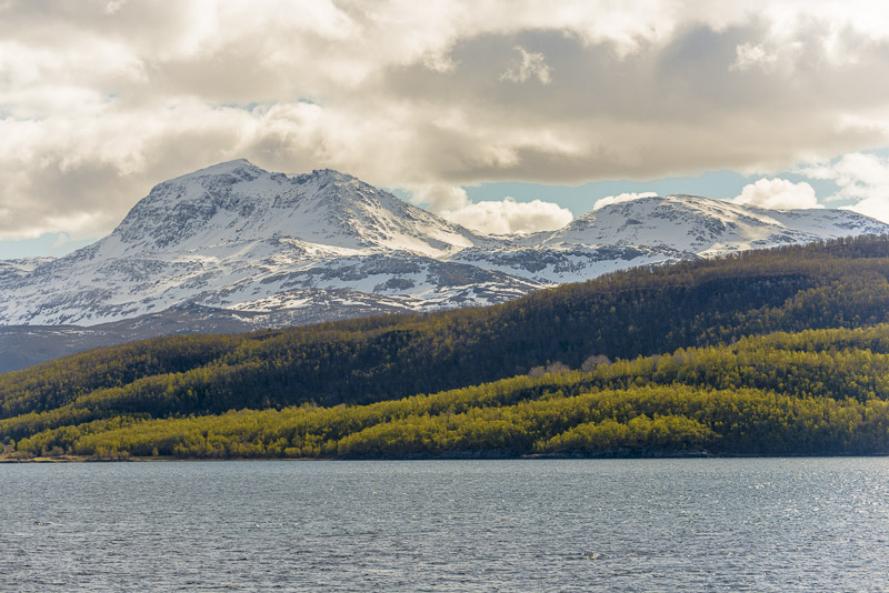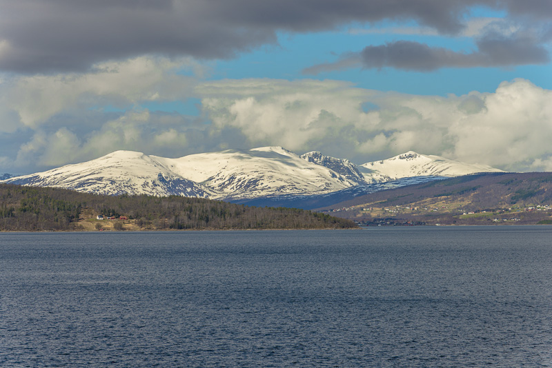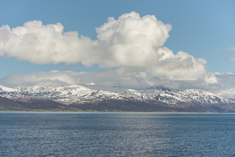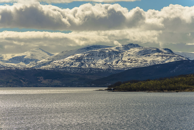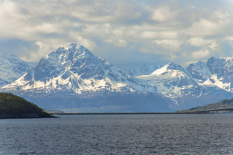 Und in Verlängerung des Sundes die Berge der Insel Andørya, Årbostadtinden (1.179 m)