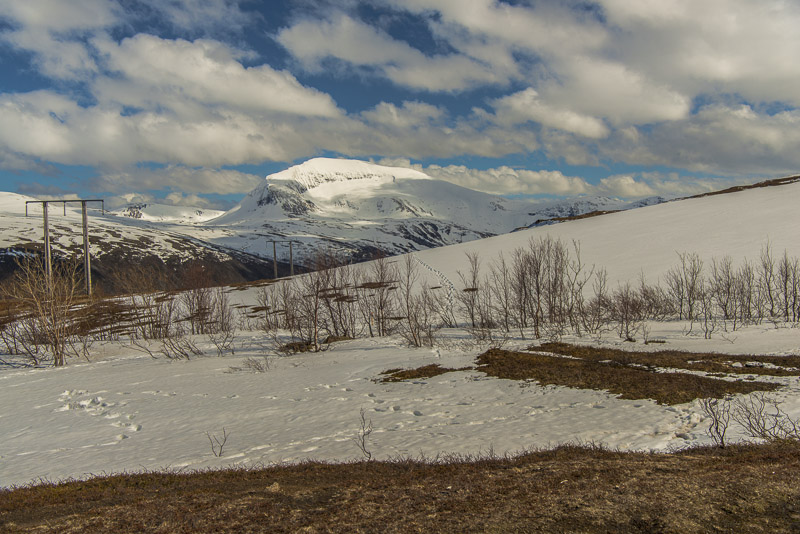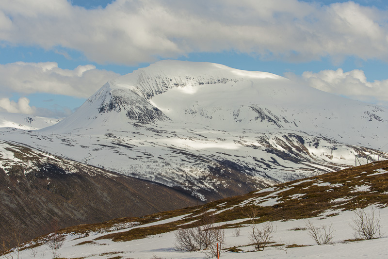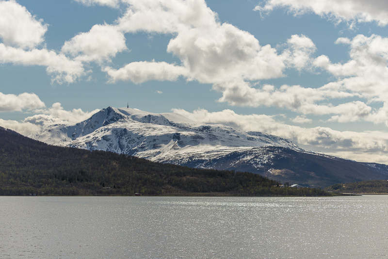 In die andere Richtung der Tromsdalstinden (1.238 m). Hier liegt noch sehr viel Schnee, unter anderem auch Neuschnee von vorgestern.
