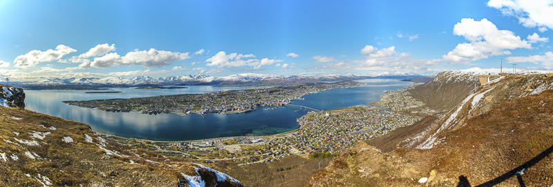 Noch ein 180 Grad - Panoramabild von Tromsø - vom Storsteinen aus aufgenommen. Hier ist auch die Seilbahnstation mit im Bild. Hierher oder ins Bild klicken für eine größere Darstellung.