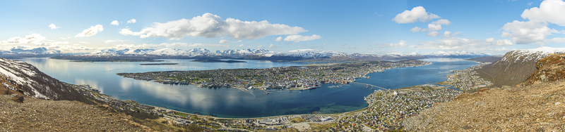 180 Grad - Panoramabild von Tromsø - vom Storsteinen aus aufgenommen. Hierher oder ins Bild klicken für eine größere Darstellung.