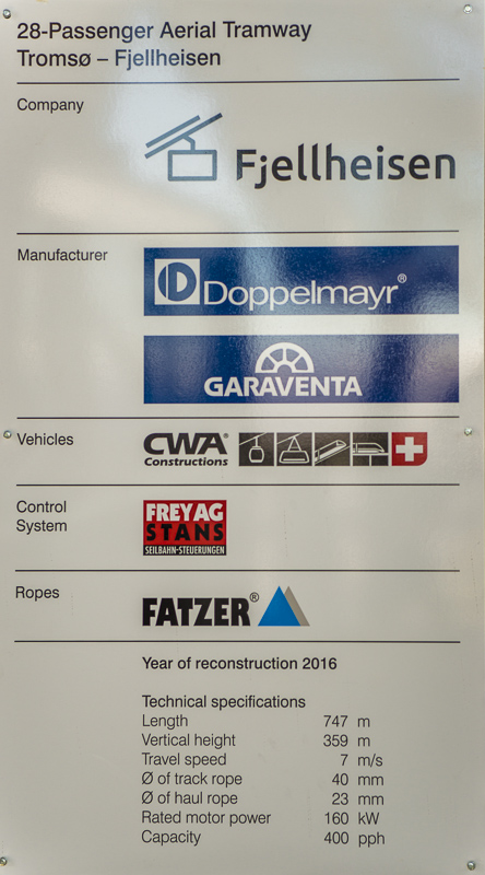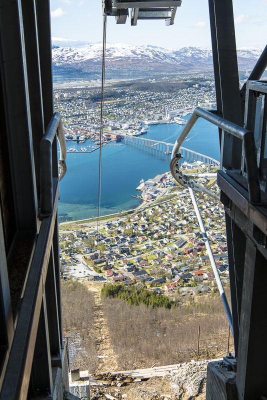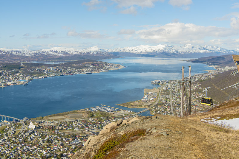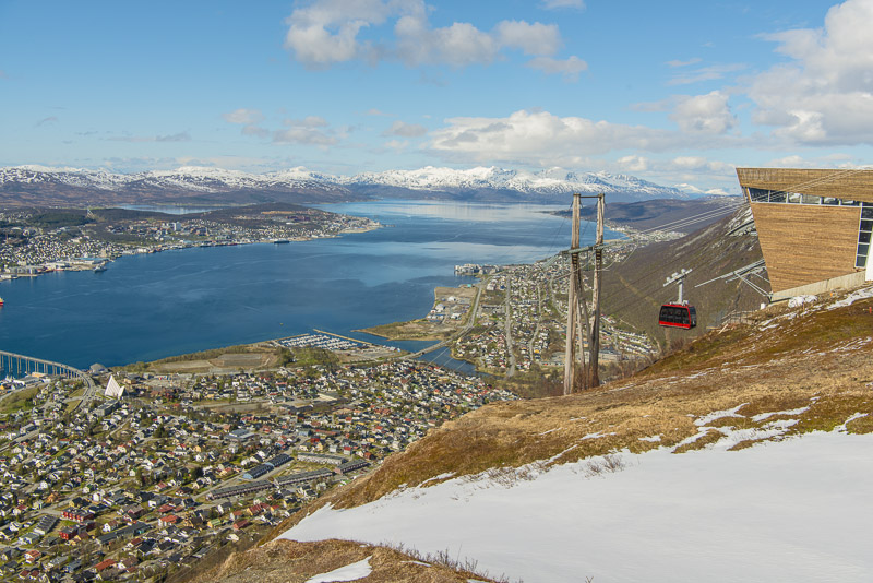 ... und eine rote, zumindest alle 30 Minuten (oder öfter nach Bedarf). Um die Mitternachtssonne sehen zu können, ist die Bahn im Hochsommer bis 1 Uhr nachts in Betrieb. Da steht die Sonne dann in dieser Richtung, hinter der Insel Ringvassøya