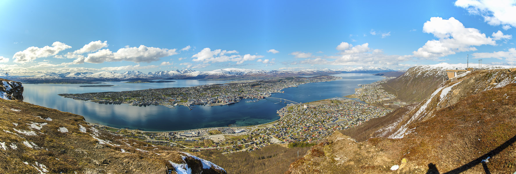 Another 180 degree panoramic picture of Tromsų - take from the Storsteinen. Also enclosed in the picture is the summit station of the cable car. 20.5.2016