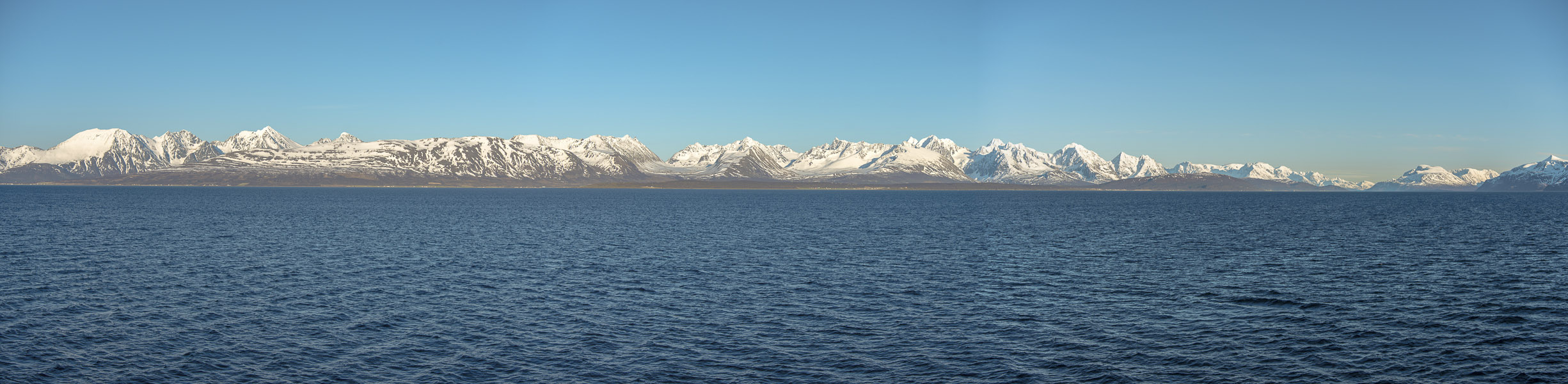 Blick in den Ullsfjord und Panoramabild der Halbinsel Lyngen. Berge bis über 1.600 m Seehöhe.