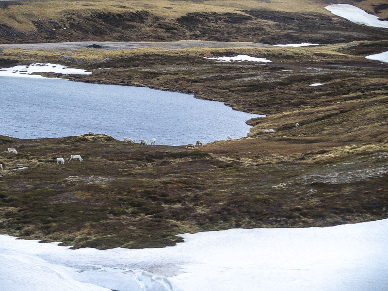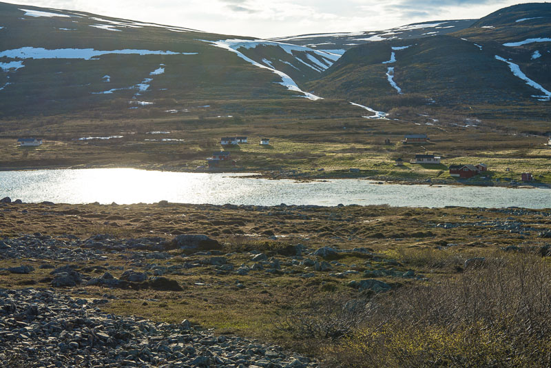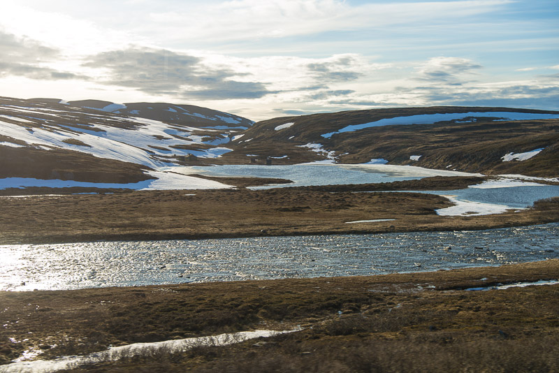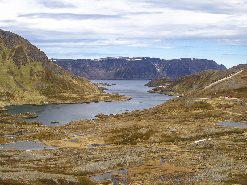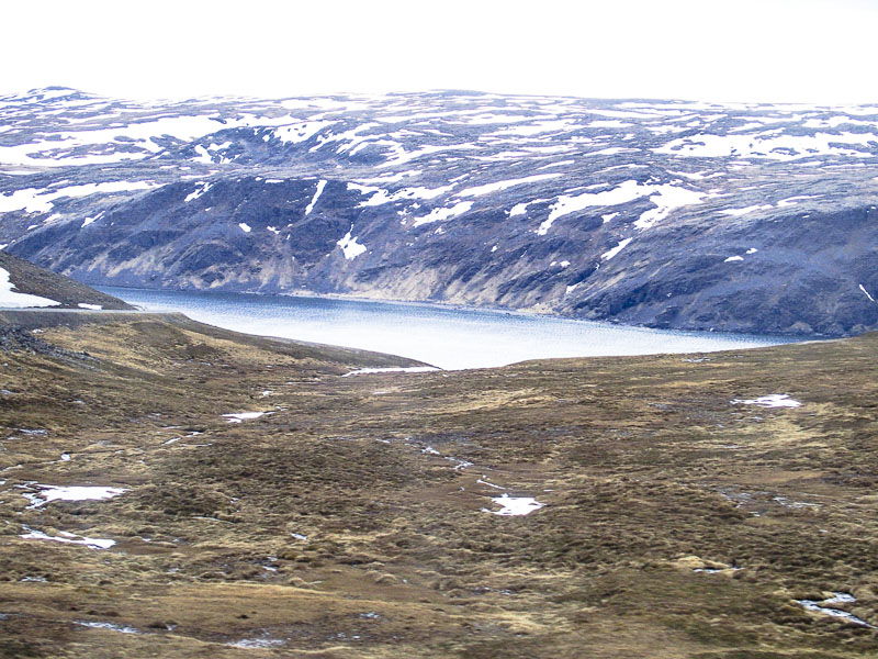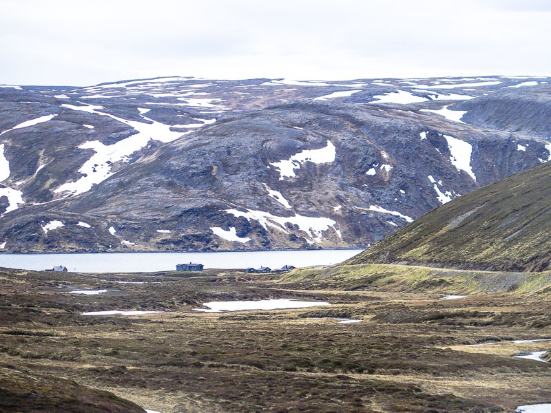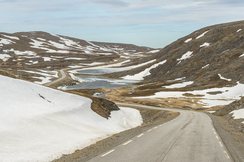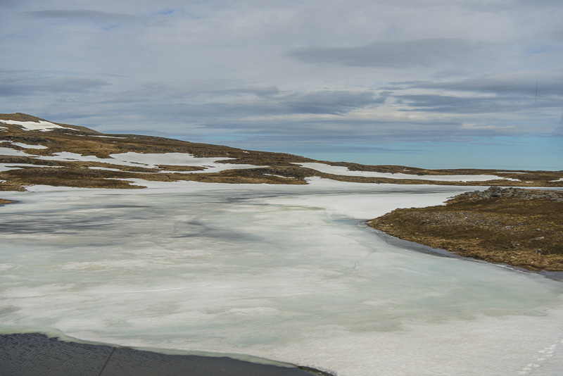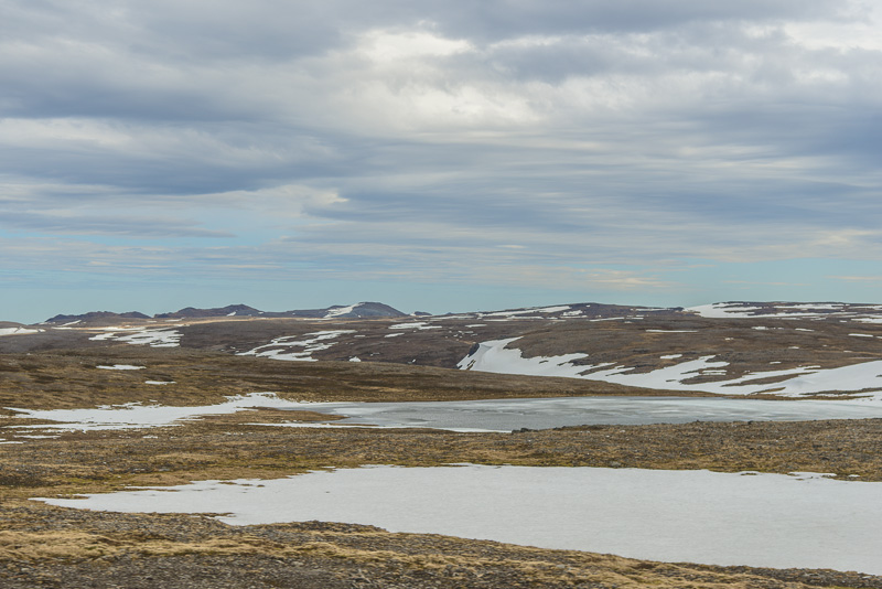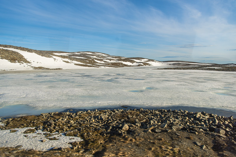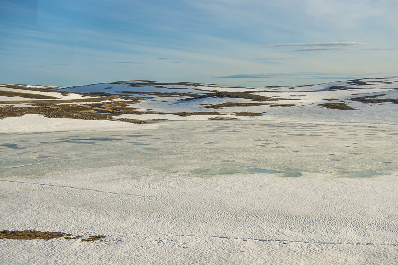 Über die Hochfläche fahren wir jetzt nach Mehamn - viel schneller als das Schiff und mit einer großen Abkürzung. Auch auf dieser Hochfläche auf knapp 300 m Seehöhe sind die Seen noch großteils zugefroren.