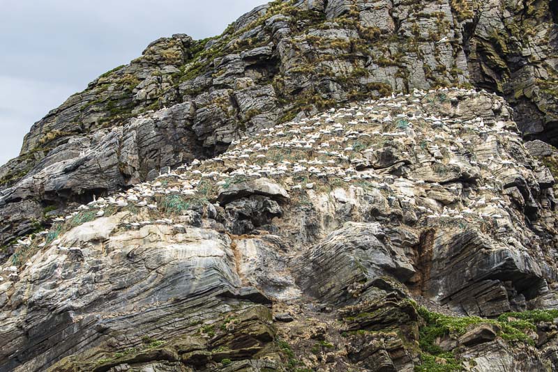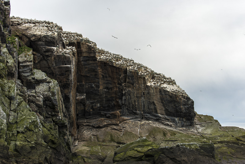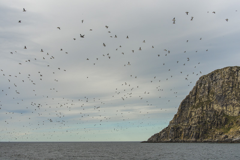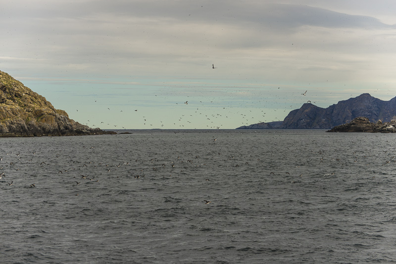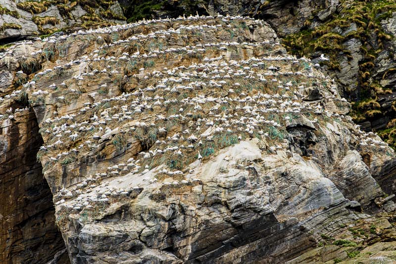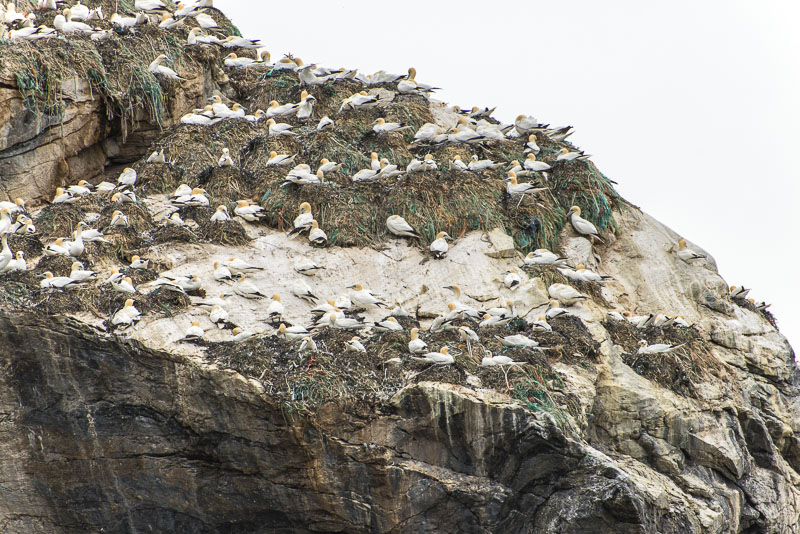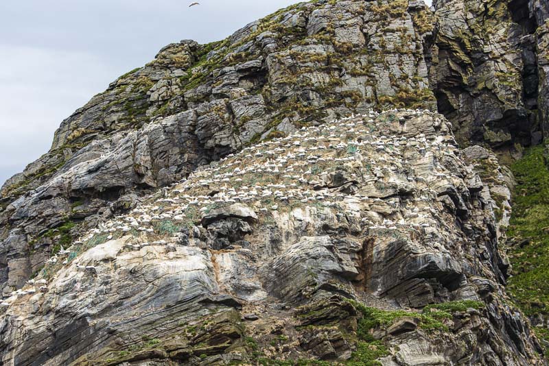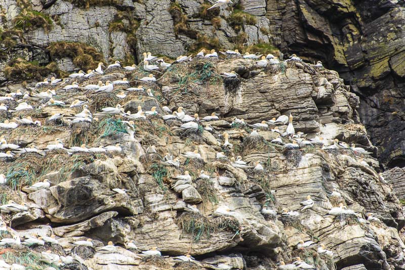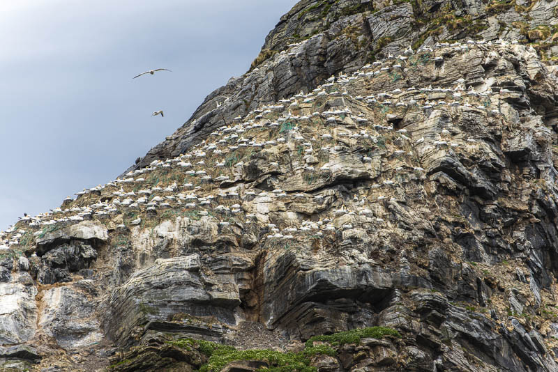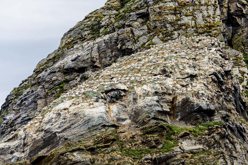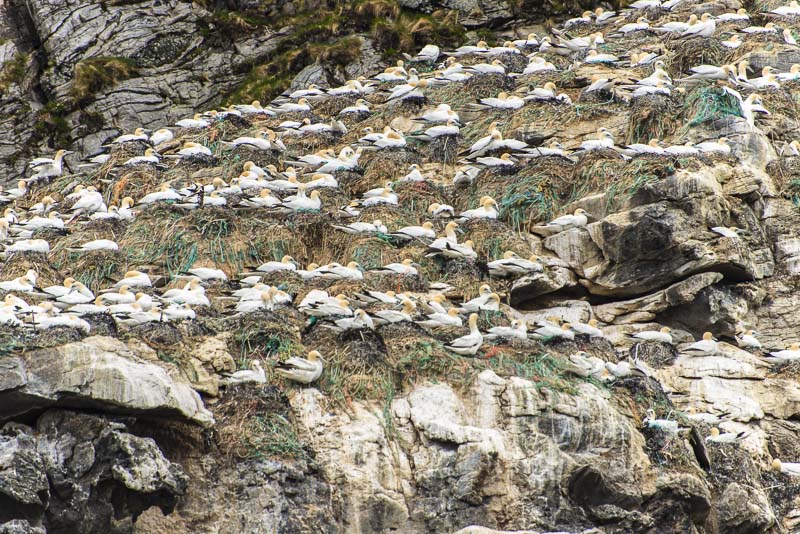 Wir fahren jetzt um den Stauren - Felsen herum. Hier gibt es eine riesige Basstölpel - Kolonie (Morus bassanus)