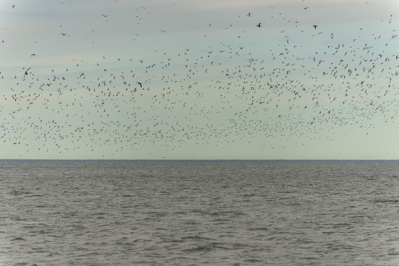 Die Möwe weiß genau, dass viele der Kormorane auffliegen, wenn das Schiff vorbei fährt. Aber noch gibt es keine Eier zu stehlen ...