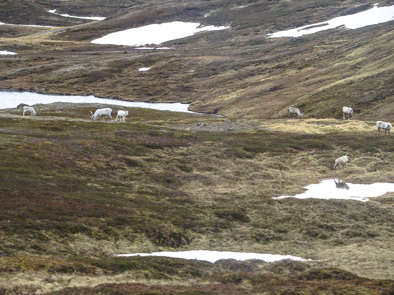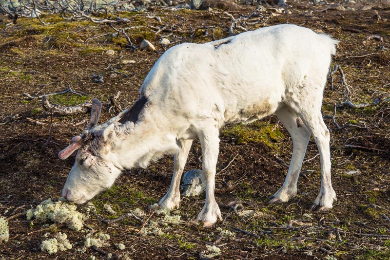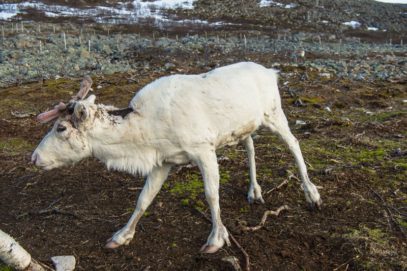 Die Rentiere, obwohl Verwandte von Hirsch und Elch, werden hier als Haustiere gehalten. Diese hier sind in einem abgezäunten Areal, damit sie von uns Touristen bewundert werden können.